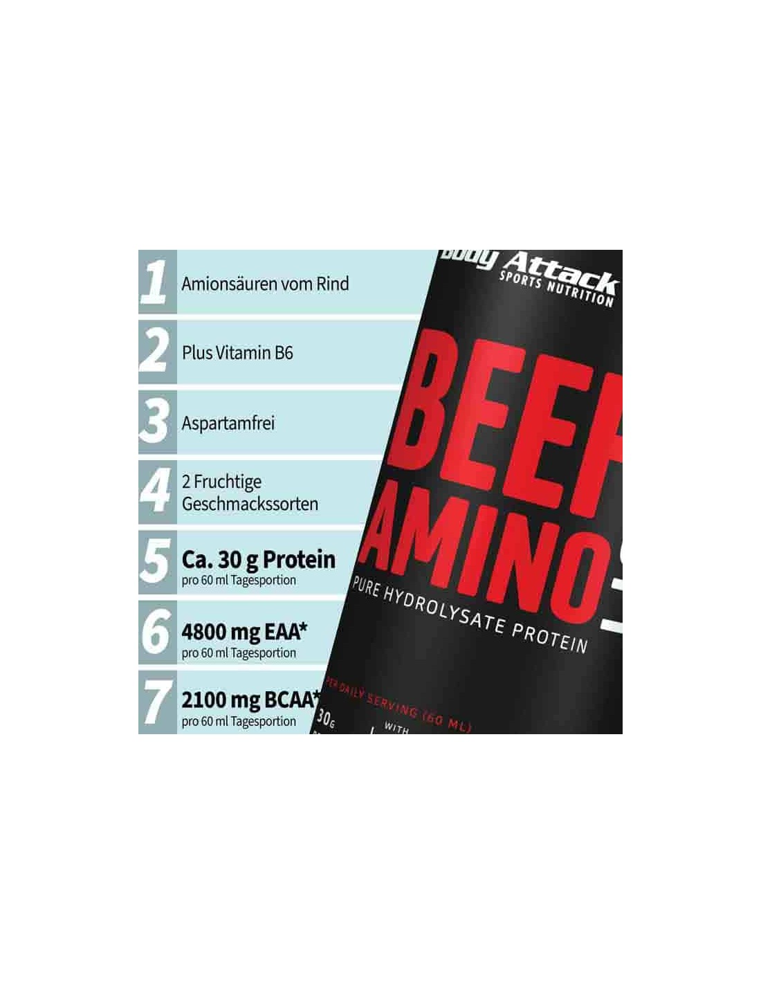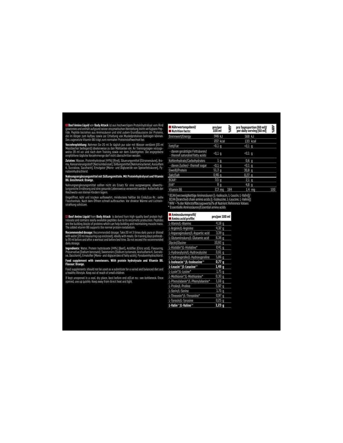 Wofür brauche ich das Amino Liquid? Die Tage sind stressig und du kommst nicht auf deinen Proteinbedarf? Du bist ordentlich am Trainieren und deine Muskeln lechzen nach genügend Treibstoff? Dann brauchst du unser erstklassiges BEEF AMINO LIQUID! Durch die ergänzende Einnahme von BODY ATTACKs BEEF AMINO LIQUID zu den Mahlzeiten kann deine eiweißbetonte Ernährung für die Muskel- und Knochenerhaltung unterstützt werden. Dafür wirken satte 30 g Protein in der täglichen Portion von 60 ml BEEF AMINO LIQUID. Das freut dich und besonders deine Muskeln.