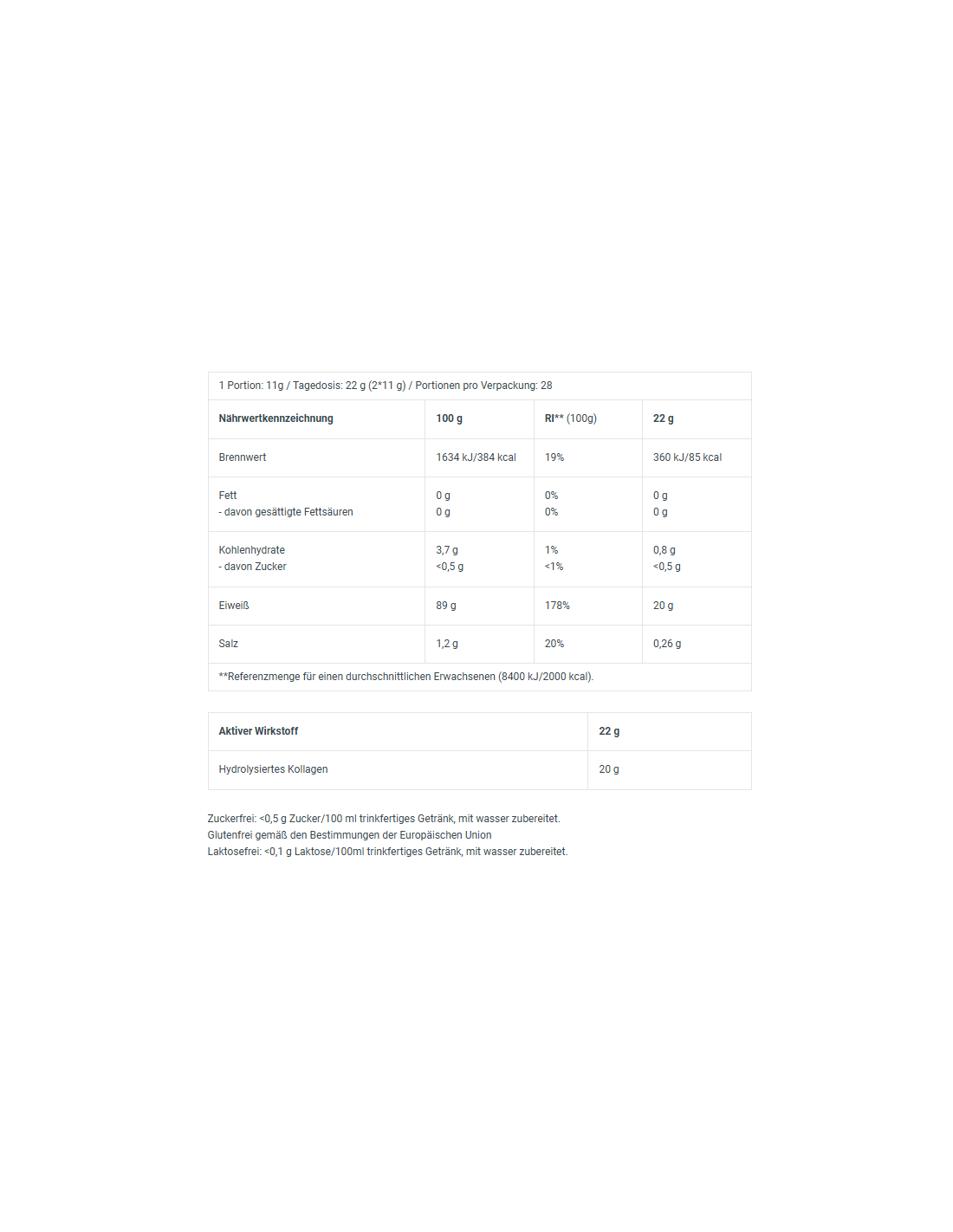 Dank des erfrischenden Getränkepulvers mit hydrolysiertem Kollagen wird dein Körper täglich mit 20 g Kollagen versorgt, um dein Bindegewebe und deine Haut zu unterstützen. Genieße die leckere und schnell lösliche Mischung als Teil deiner täglichen Schönheitsroutine!
