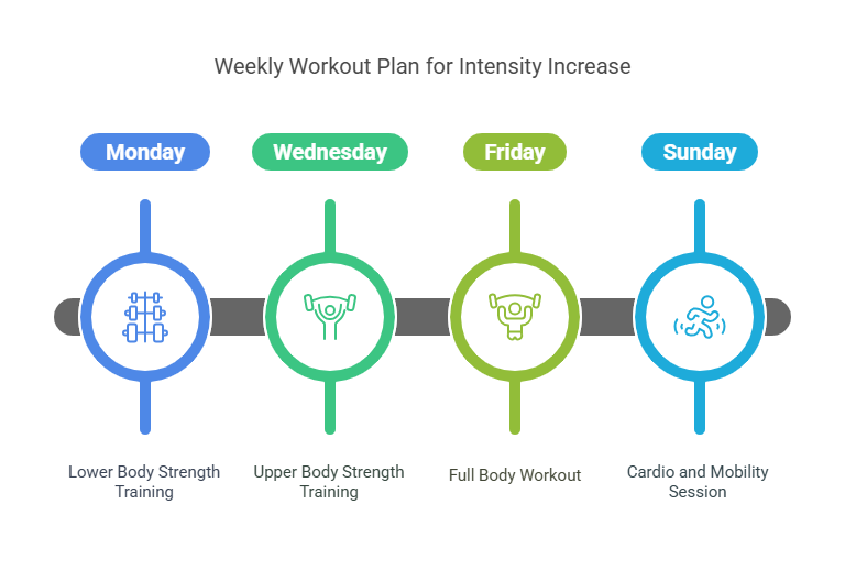 · Woche 3-4: Steigerung der Gewichte, geringere Wiederholungen und intensivere Übungen