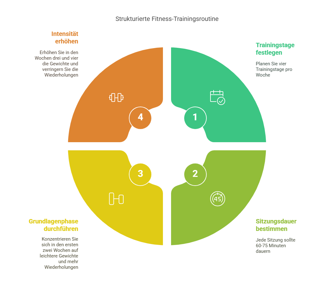 · Woche 1-2: Fokus auf Grundlagen, leichtere Gewichte, mehr Wiederholungen