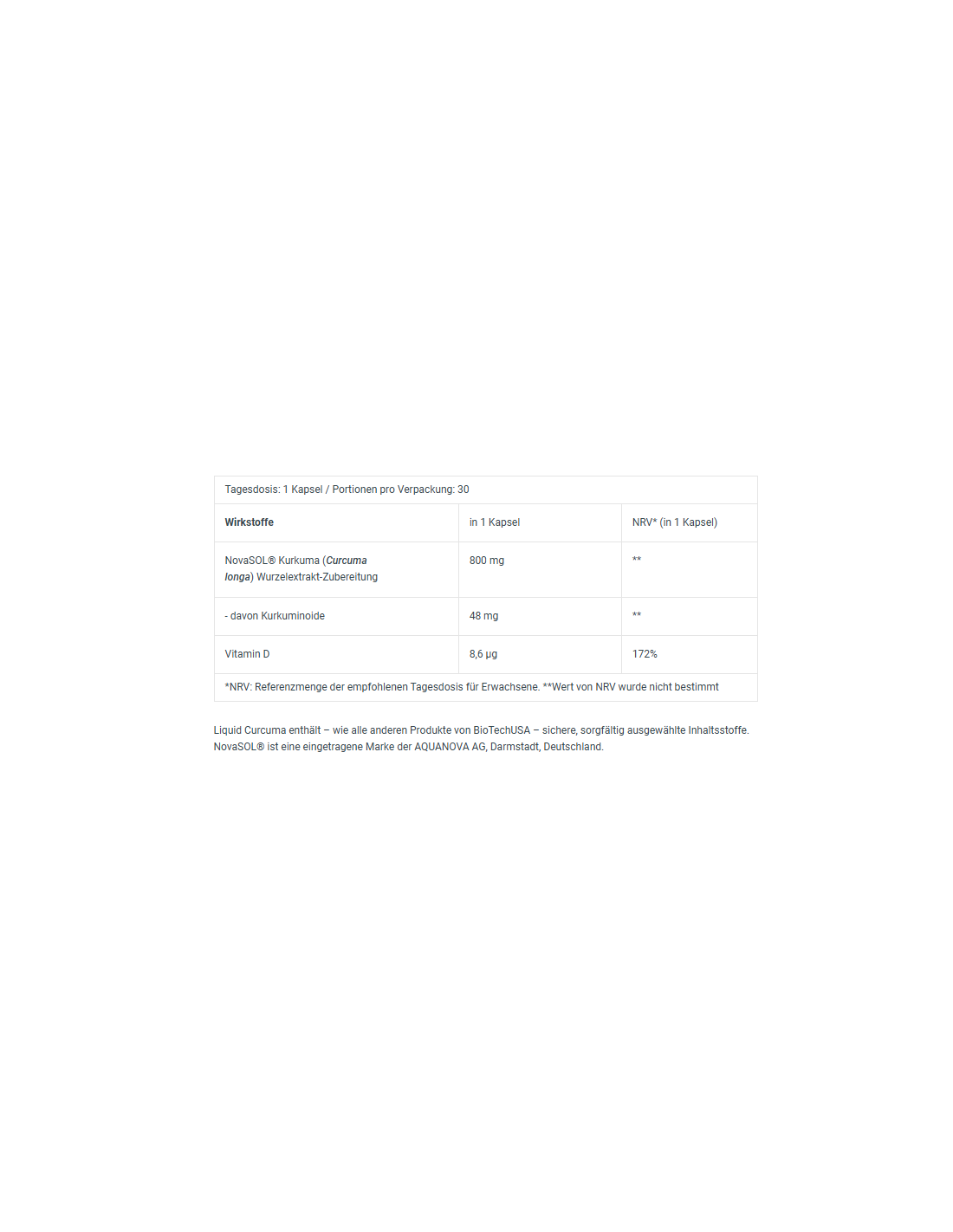 NovaSOL® Kurkuma (Curcuma longa) Wurzelextrakt- Zubereitung 84,4% [Emulgator (E 433), Kurkuma Wurzelextrakt, Cholecalciferol], Kapselhülle [Stabilisator (Hydroxypropylmethylcellulose)], Antioxidationsmittel (Ascorbinsäure).
