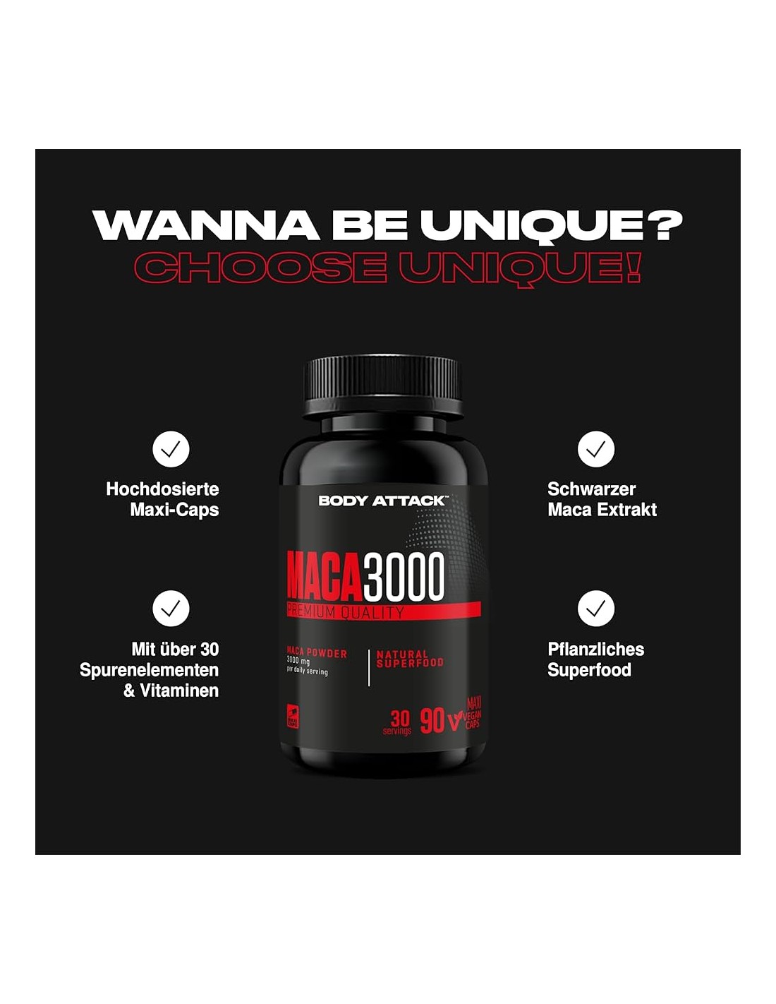 Mit Body Attack Maca 3000 bringst Du Deine Leistungsfähigkeit auf das nächste Level und stärkst gleichzeitig Dein Wohlbefinden – genau das, was Du für Deine Fitnessziele brauchst. Spüre, wie Dich die Kraft der Maca-Wurzel aus den peruanischen Anden energiegeladen durch jedes Training begleitet und Dir hilft, mehr aus Dir herauszuholen.