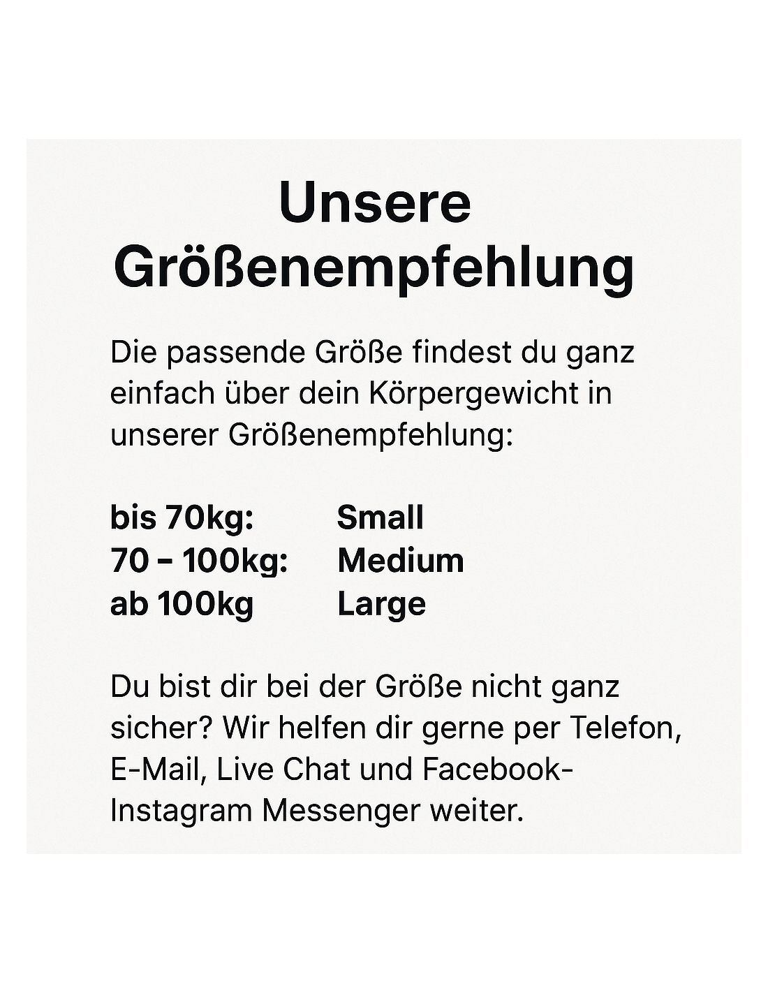 Die passende Größe findest du ganz einfach über dein Körpergewicht in unserer Größenempfehlung:
