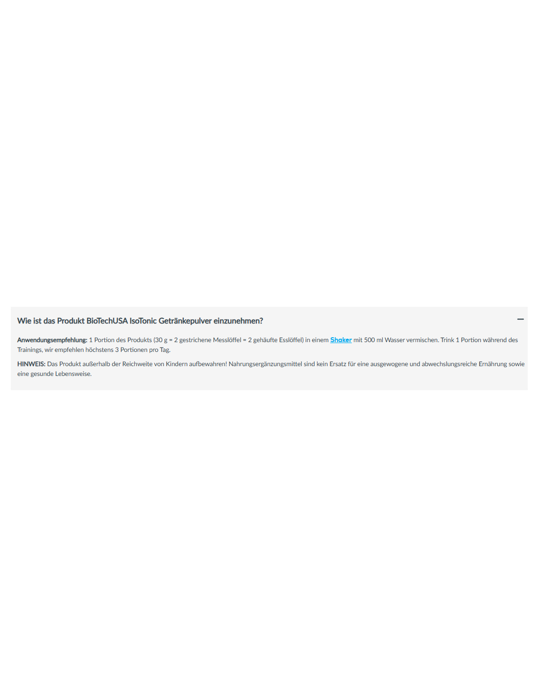Anwendungsempfehlung: 1 Portion des Produkts (30 g = 2 gestrichene Messlöffel = 2 gehäufte Esslöffel) in einem Shaker mit 500 ml Wasser vermischen. Trink 1 Portion während des Trainings, wir empfehlen höchstens 3 Portionen pro Tag.