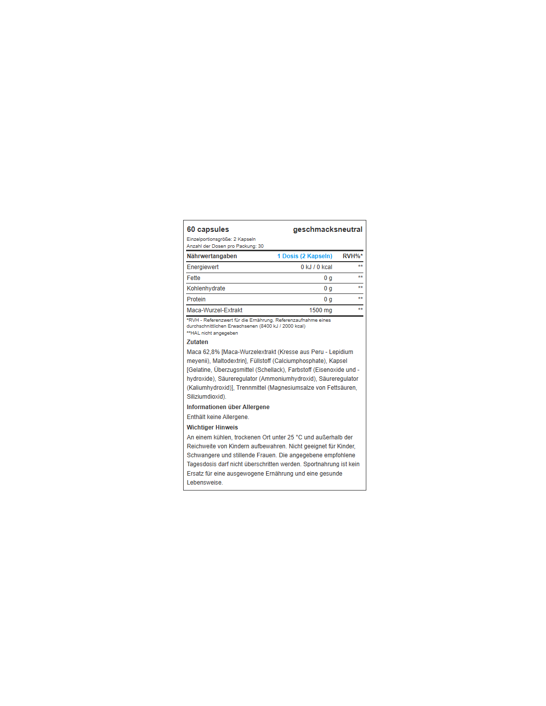 - Maca Extrakt 62.8% [Maca (Lepidium meyenii) Wurzelextrakt, Maltodextrin], Füllstoff (Calciumphosphate), Kapselhülle [Gelatine, Überzugmittel (Schellack), Farbstoff (Eisenoxide und -hydroxide), Säureregulator (Ammoniumhydroxid), Säureregulator (Kaliumhydroxid)], Trennmittel (Magnesiumsalze der Speisefettsäuren, Siliciumdioxid).