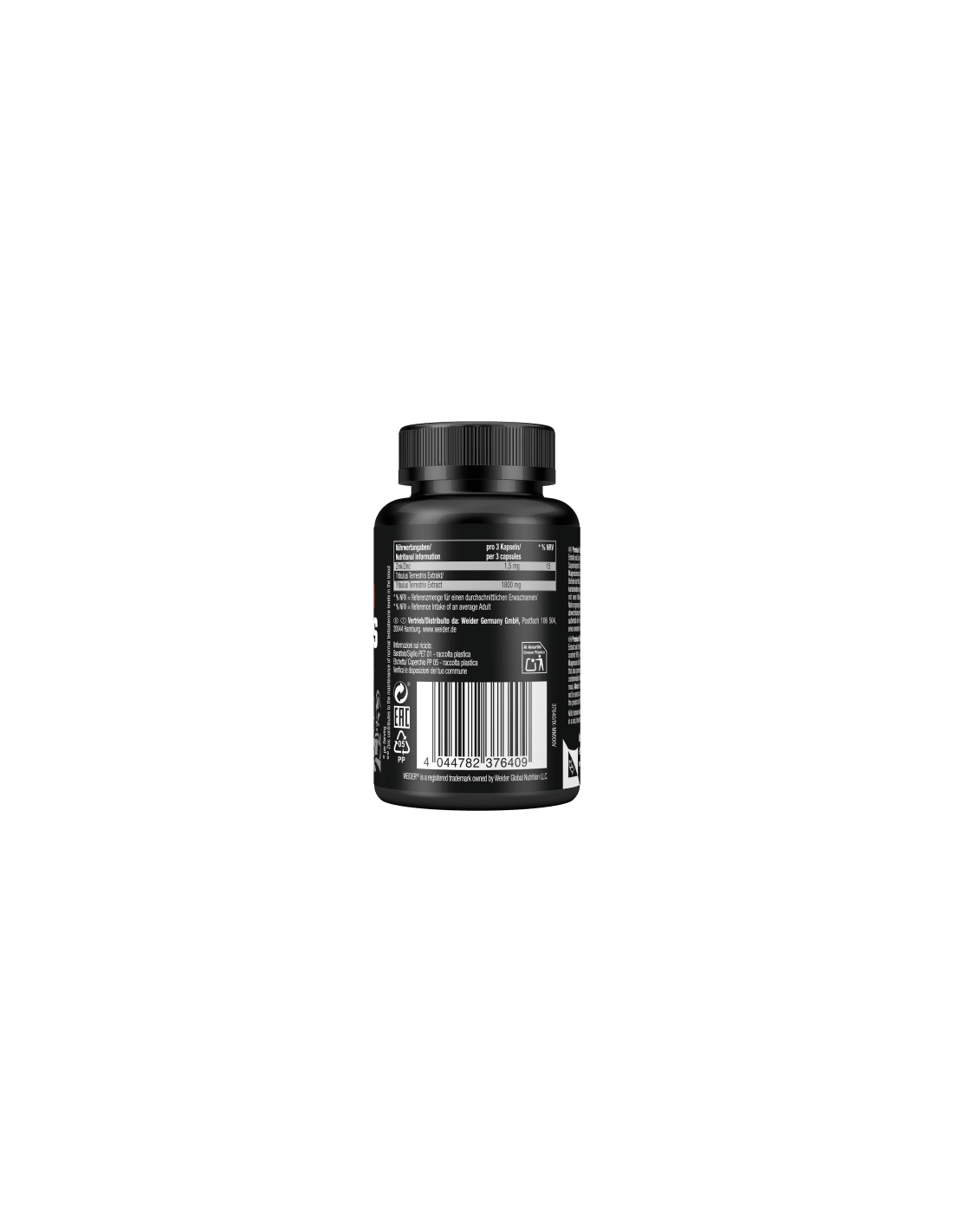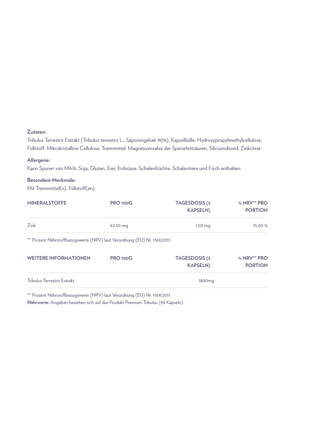 - Tribulus Terrestris Extrakt (Tribulus terrestris L., Saponingehalt 90%), Kapselhülle: Hydroxypropylmethylcellulose; Füllstoff: Mikrokristalline Cellulose; Trennmittel: Magnesiumsalze der Speisefettsäuren, Siliciumdioxid; Zinkcitrat. Hergestellt in einem Betrieb der Milch, Soja, Gluten, Eier, Erdnüsse, Schalenfrüchte, Schalentiere und Fisch verarbeitet (Kreuzkontamination möglich).