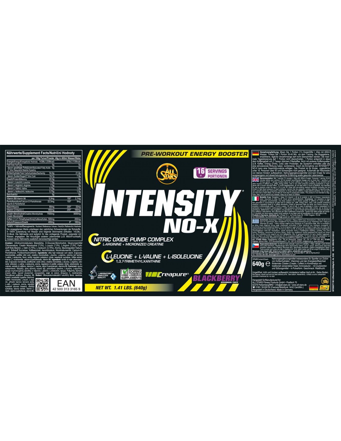 All-Stars Intensity NO-X ist ein neu entwickelter NO-Booster der All Stars Research Group. Der fettfreie Pre-Workout Energy Booster zur Einnahme vor dem Training besteht aus fünf wesentlichen Komponenten Nitric Oxide Pump Complex mit L-Arginin und Micronized Creatin Monohydrat, Anti-Catabolic-Amino-Acids 2:1:1 (Aminosäuren L-Leucin, L-Valin und L-Isoleucin), ULTRA CARB (3-Stage Carbohydrate Blend mit ultrahochmolekularer Maisstärke, D-Glukose-Monohydrat, Maltobiose) und dem Stimulator Methylxanthin.