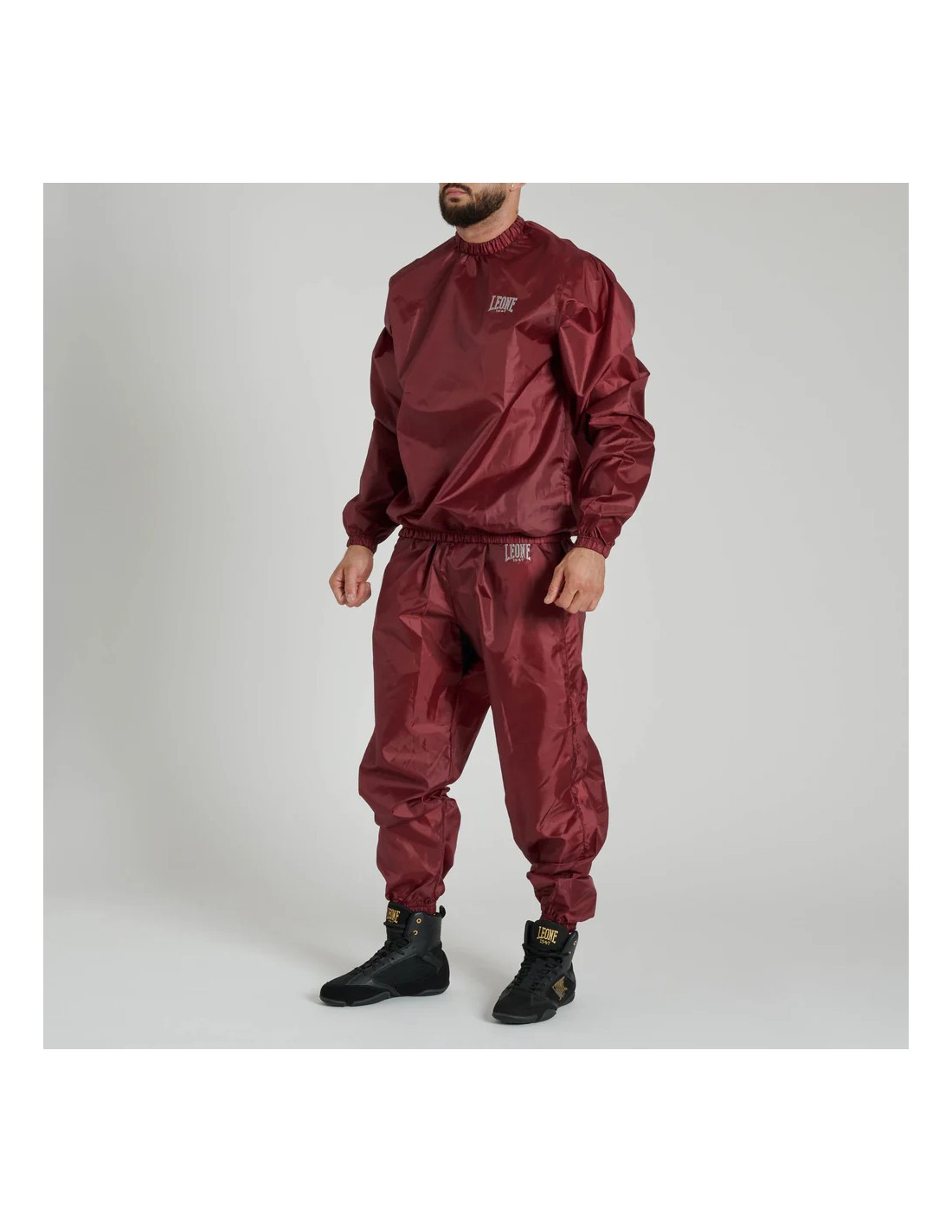 Der elastische Bund und die Manschetten für Hüften und Knöchel sorgen für eine perfekte Passform und verhindern ein Verrutschen während des Trainings. Das LEONE-Logo ist auf beiden Teilen des Saunaanzugs gestickt, was ihm ein stilvolles und ansprechendes Aussehen verleiht.