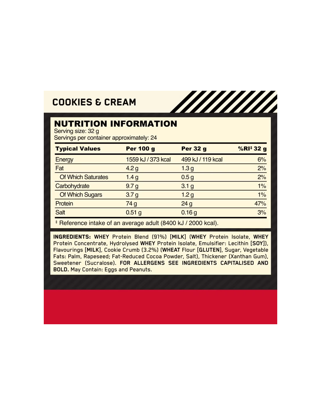 - Proteinmischung (Molkenproteinisolat, Molkenproteinkonzentrat, hydrolisiertes Molkenproteinisolat, Emulgator: Sojalecithin). Allergene: Enthält Soja, Milcherzeugnisse.