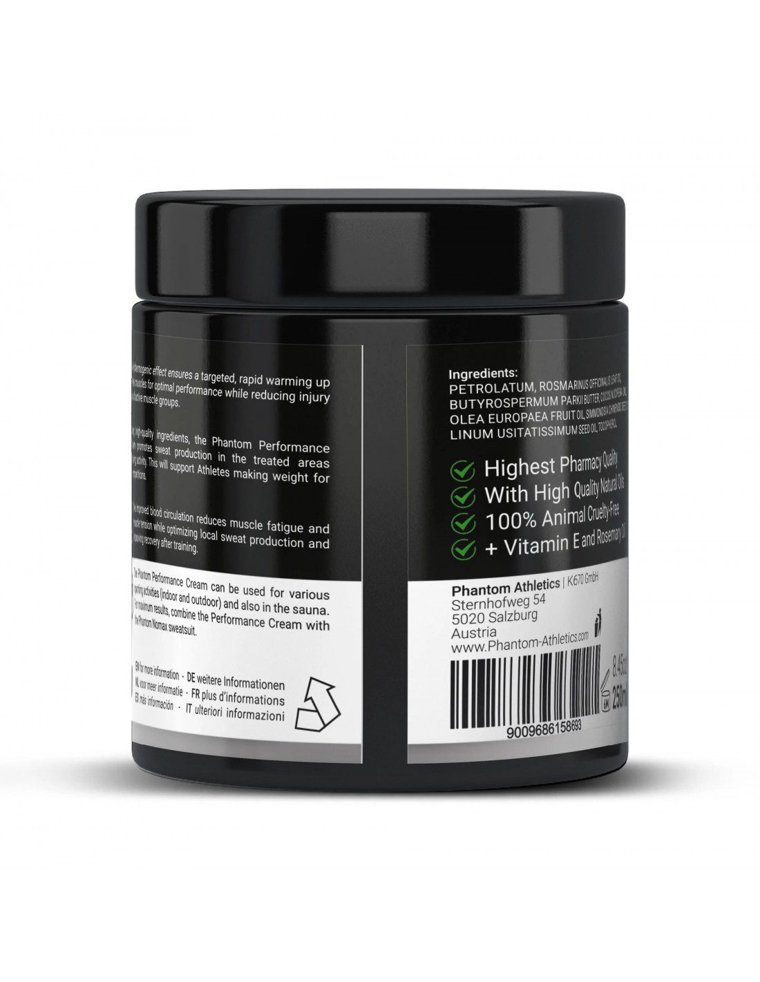 L'efficacité de la crème Phantom Performance a été confirmée par des athlètes professionnels et elle est fabriquée dans la plus haute qualité de pharmacie. Fais donc confiance à un produit développé par des experts et répondant aux normes de qualité les plus élevées. De plus, la crème Phantom Performance est fabriquée en Autriche, ce qui témoigne encore une fois de sa qualité exceptionnelle.