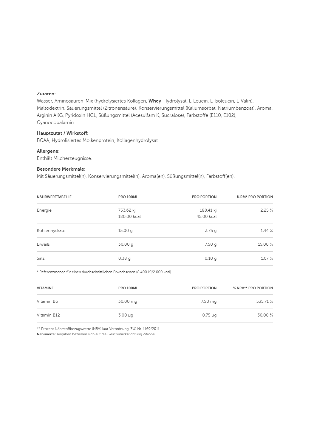 Zitrone: Trinkwasser, hydrolysiertes Kollagen 29,5%, Invertzucker, Maltodextrin, Säuerungsmittel (Citronensäure), Molkenproteinhydrolysat 0,38%, L-Arginin 0,25%, Aroma, Konservierungsstoffe (Sorbinsäure, Natriumbenzoat), L-Leucin 0,05%, L-Valin 0,025%, L-Isoleucin 0,025%, Süßungsmittel (Acesulfam K, Sucralose), Pyridoxinhydrochlorid, Cyanocobalamin.