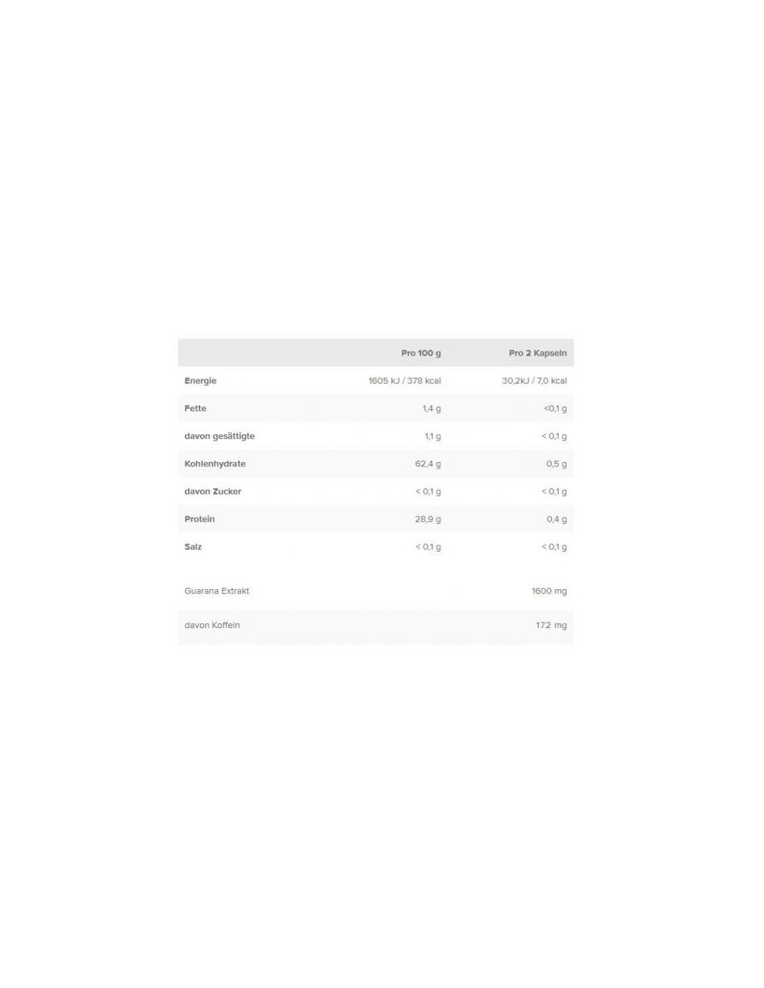 Guarana-Extrakt (82,8%), Rindergelatine (Kapselhülle), , Füllstoff (mikrokristalline Cellulose), Trennmittel (Magnesiumsalze der Speisefettsäuren), Palmöl.