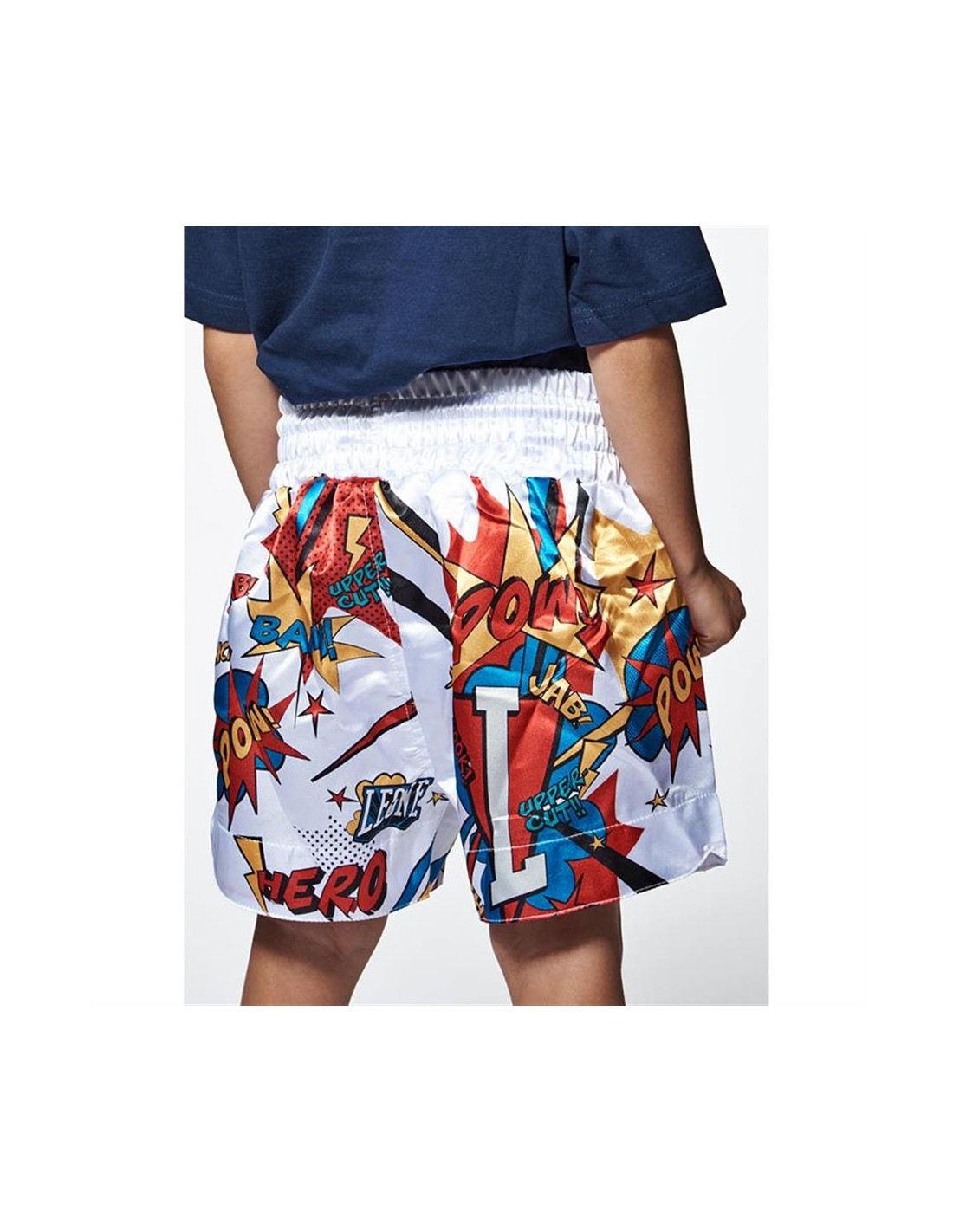 Le short thaï Leone Hero JR est parfait pour les jeunes kickboxeurs et les champions de muay thaï. Le tissu 100% satin et la taille élastique assurent un confort optimal. Avec leur design unique de bande dessinée, ces shorts améliorent la tenue et la confiance en soi de celui qui les porte. Des gants de boxe assortis sont également disponibles pour rendre l'entraînement encore plus efficace.