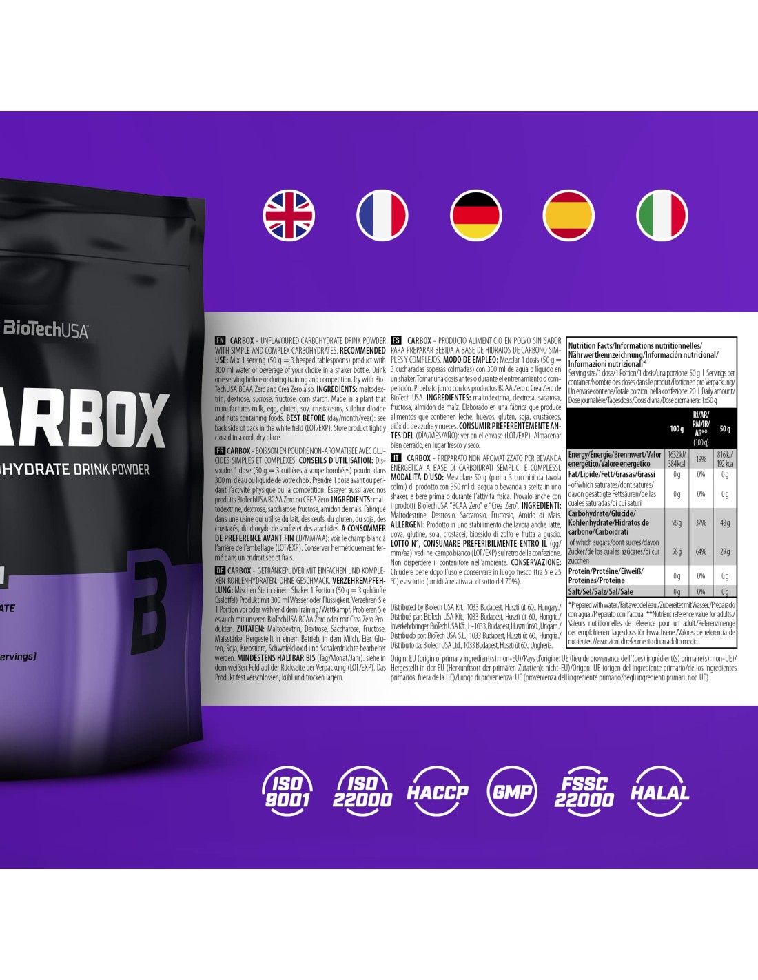 La poudre BioTech USA Carbox est composée de cinq fournisseurs d’énergie. La combinaison de maltodextrine, ribose, dextrose, fructose et palatinose rend la composition unique. La poudre est fabriquée sans ajout d'arômes, de colorants ou d'arômes. Aucun édulcorant artificiel n’est également inclus. Le Carbox Biotech USA convient également aux végétaliens. Une légère douceur naturelle rend Carbox BioTech USA agréable à consommer.