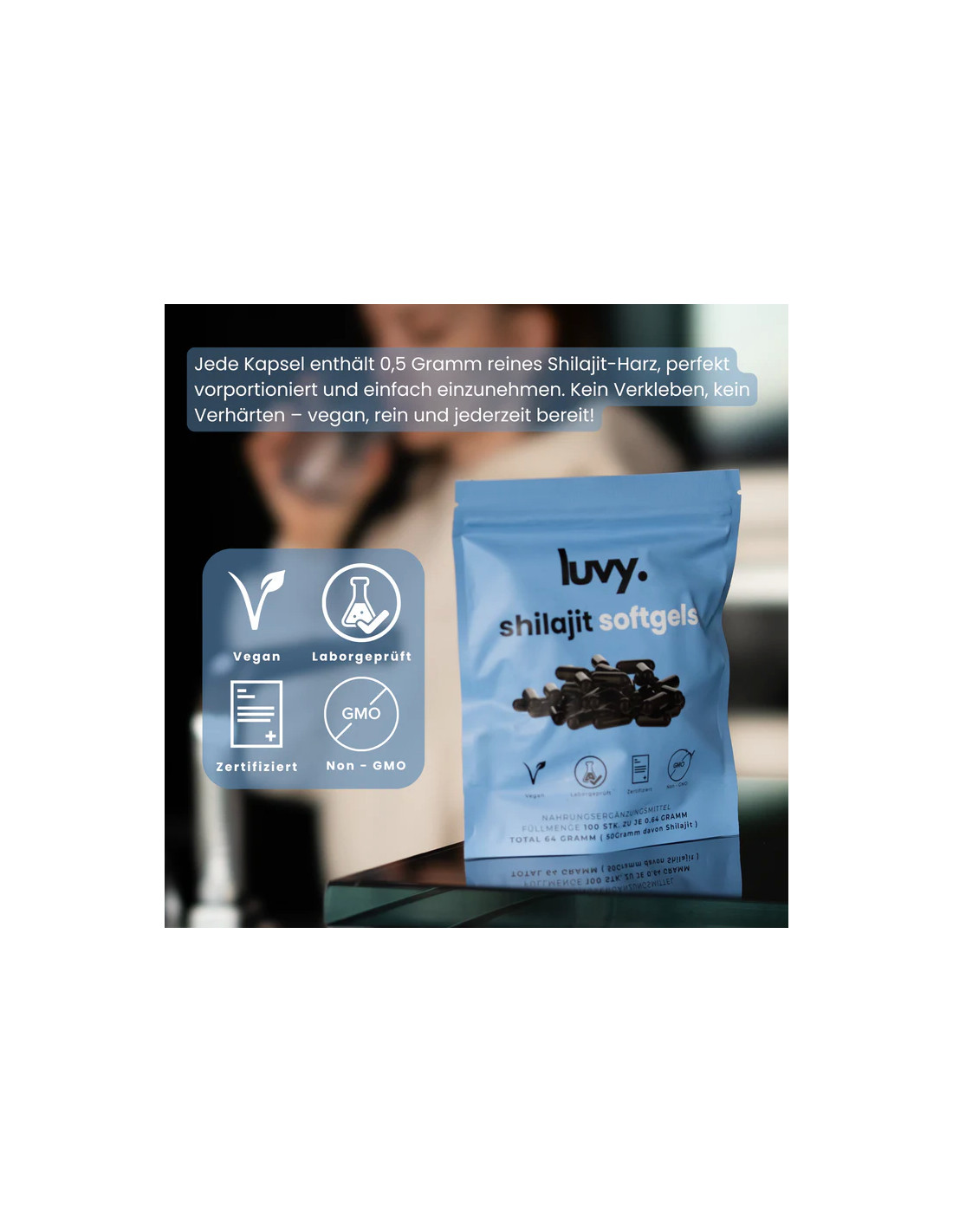 Découvrez la puissance de la nature avec nos capsules molles LUVY Shilajit, qui vous aideront à atteindre vos objectifs fitness. Ces petites merveilles de l'Himalaya ne sont pas seulement un complément alimentaire ; elles sont votre partenaire d'entraînement personnel, vous accompagnant sur votre chemin vers plus de vitalité et de bien-être. Leur composition 100 % végétale vous garantit le meilleur pour votre corps, sans additifs ni produits chimiques.