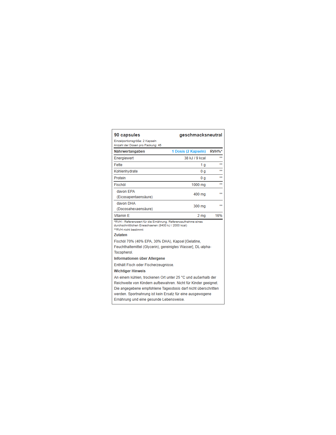 Fischöl 70% [56% Omega-3 (28% EPA, 21% DHA)], Kapselhülle [Gelatine, Feuchthaltemittel (Glycerin), Trinkwasser], DL-α-Tocopherol.