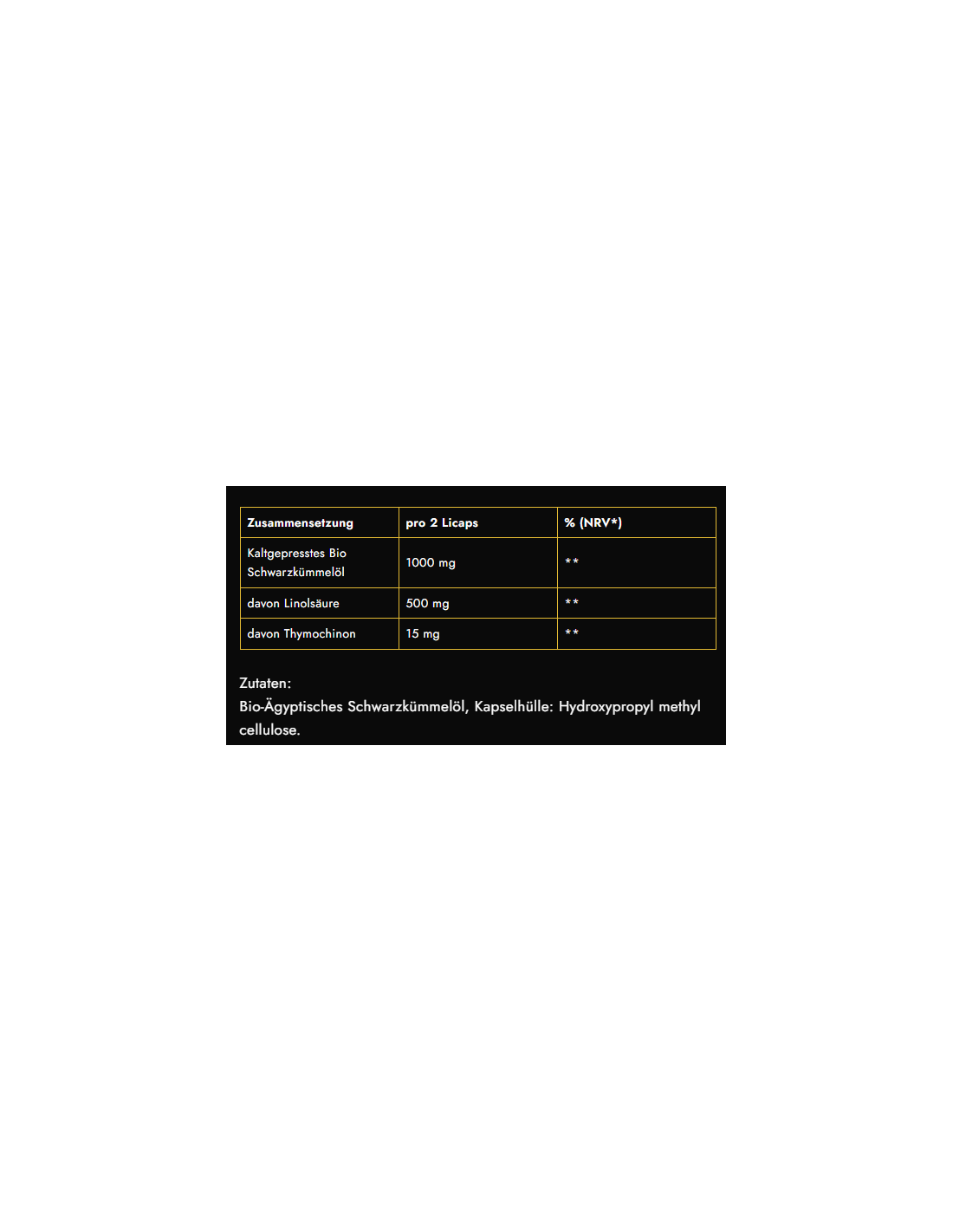 Zutaten: Kaltgepresstes Schwarzkümmelöl (davon 55% Omega 6 (Linolsäure), davon 18% Omega 9 (Ölsäure)), Füllstoff: Stearinsäure, Kapselhülle: Hypromellose, Hydroxypropylmethylcellulose.