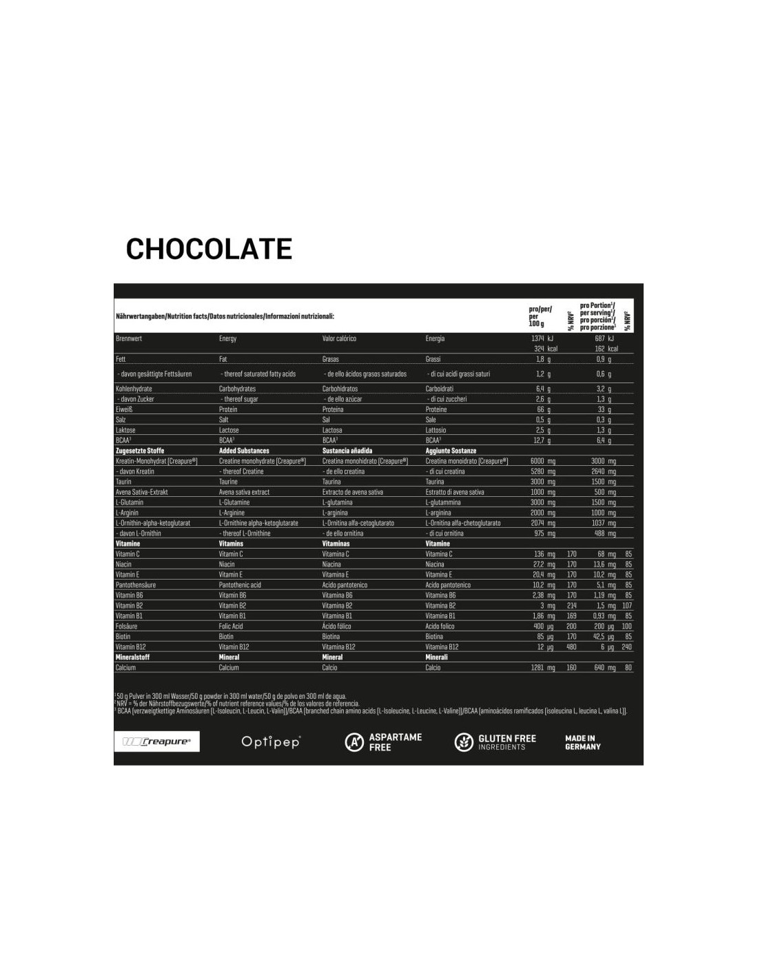 Chocolat : Concentré de protéines de lactosérum (34,9%), protéines de lait (32,9%), créatine monohydrate (Creapure®) (6%), poudre de cacao fortement dégraissé (6%), taurine, L-glutamine (3%), arôme, L-ornithine-alpha-ketoglutarate (2,1%), hydrolysat de petit-lait blanc (Optipep®) (2%), L-arginine (2%), carbonate de calcium, poudre de protéines de poulet (1%), extrait d'avoine verte (Avena Sativa) (sans gluten), Épaississant (farine de graines de guar), édulcorants (acésulfame K, sucralo- se), phosphate dicalcique, sel de cuisine, émulsifiant (mono- et diglycérides d'acides gras), acide L-ascorbique, Nicotinamide, DL-alpha tocophérylacétate, D-pantothénate de calcium, riboflavine, chlorhydrate de pyridoxine, thiamine mo- nonitrate, acide ptéroylmonoglutamique, D-biotine, cyanocobalamine.