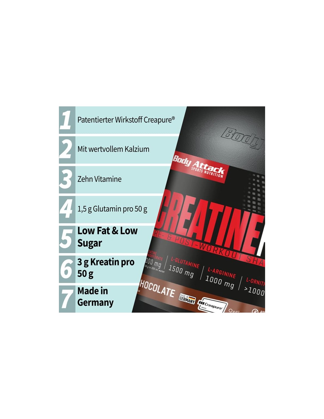 Par shake (50 g de poudre) fournit Body Attack Creatine Protein 3.000 mg de créatine monohydrate (Creapure®), connue pour augmenter les performances dans l'entraînement de la force rapide. Les créatines sont des substrats riches en énergie qui donnent de la puissance aux muscles pendant l'entraînement. Pour y parvenir, il faut prendre au moins 3 g de créatine par jour. C'est justement pendant la phase de construction que la charge musculaire est très élevée, c'est pourquoi les muscles consomment aussi plus de créatine lors d'un effort court et intense.
