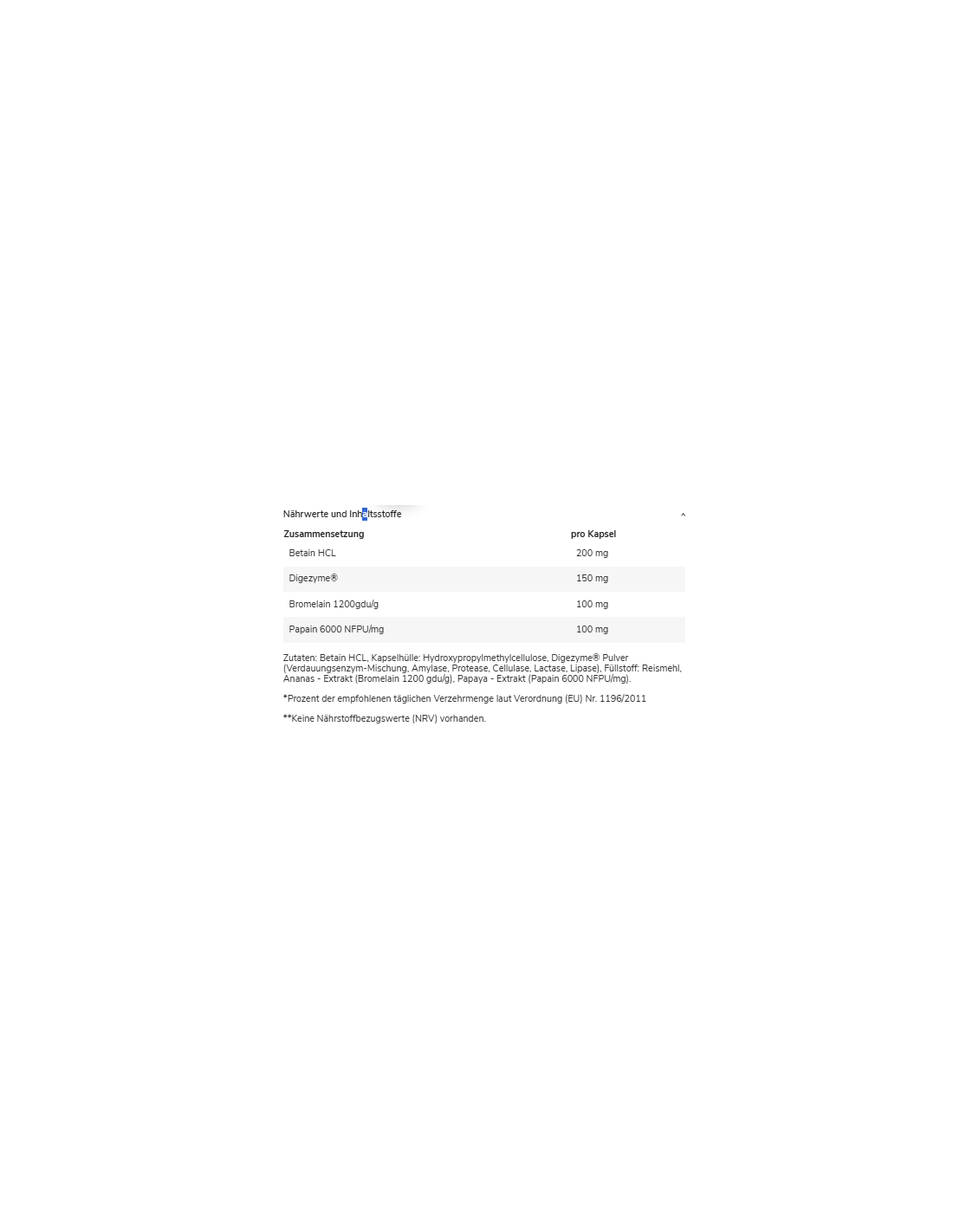 Zutaten: Betain HCL, Kapselhülle: Hydroxypropylmethylcellulose, Digezyme® Pulver (Verdauungsenzym-Mischung, Amylase, Protease, Cellulase, Lactase, Lipase), Füllstoff: Reismehl, Ananas - Extrakt (Bromelain 1200 gdu/g), Papaya - Extrakt (Papain 6000 NFPU/mg).