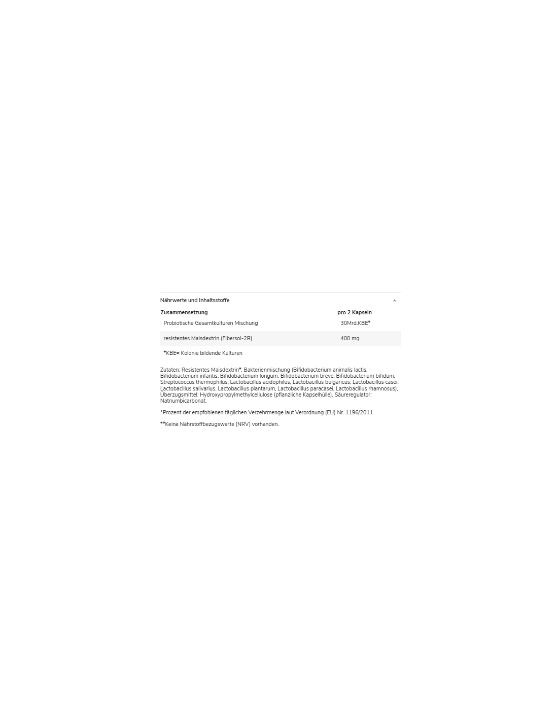 Zutaten: Resistentes Maisdextrin*, Bakterienmischung (Bifidobacterium animalis lactis, Bifidobacterium infantis, Bifidobacterium longum, Bifidobacterium breve, Bifidobacterium bifidum, Streptococcus thermophilus, Lactobacillus acidophilus, Lactobacillus bulgaricus, Lactobacillus casei, Lactobacillus salivarius, Lactobacillus plantarum, Lactobacillus paracasei, Lactobacillus rhamnosus), Überzugsmittel: Hydroxypropylmethylcellulose (pflanzliche Kapselhülle), Säureregulator: Natriumbicarbonat.