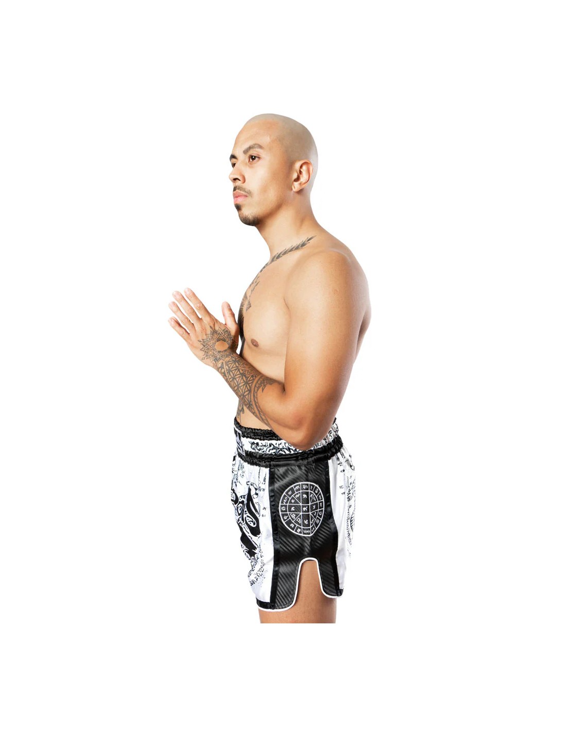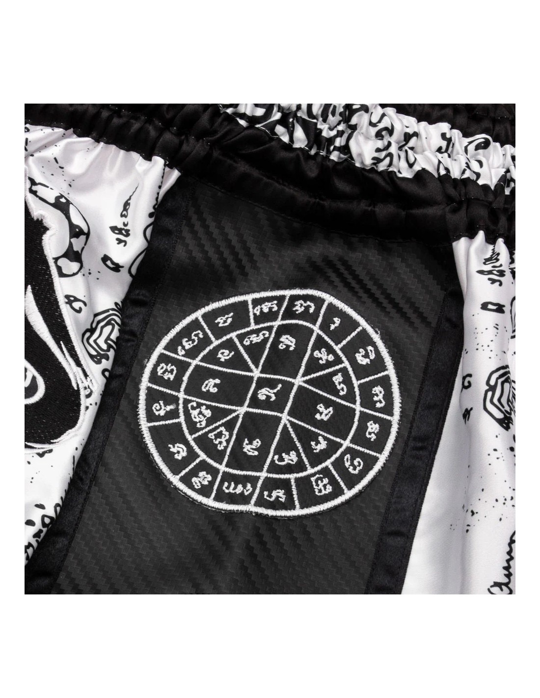 Les braguettes très échancrées garantissent une liberté de mouvement ultime pour toutes les techniques de kick ou de genou. La taille étroite du pantalon assure un ajustement confortable. Les pantalons sont entièrement sublimés et portent plusieurs véritables Sak Yants. Les côtés du pantalon sont en carbone et ornent un autre patch Sak Yant.