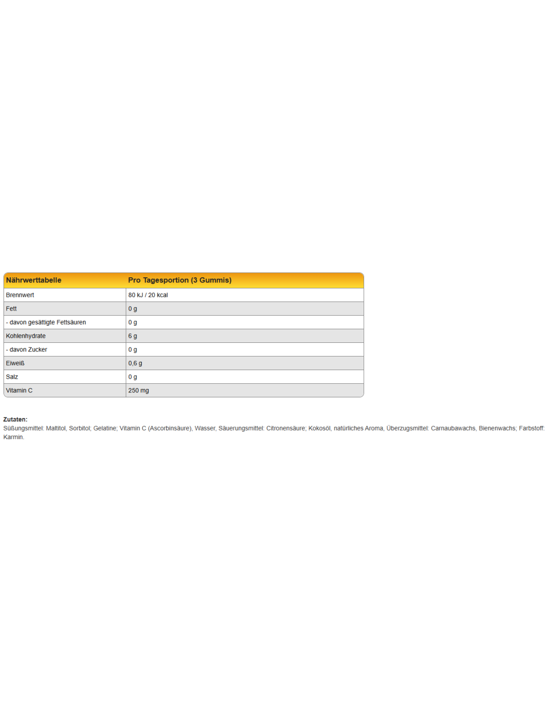 Chaque bonbon gélifié est confectionné avec soin et offre une texture idéale : suffisamment moelleux pour une mastication agréable, mais assez ferme pour ne pas coller. Son intense saveur d'orange, ni artificielle ni trop forte, vous transporte directement en été – parfait pour tous ceux qui apprécient la qualité et le goût. Prendre de la vitamine C devient un plaisir quotidien.