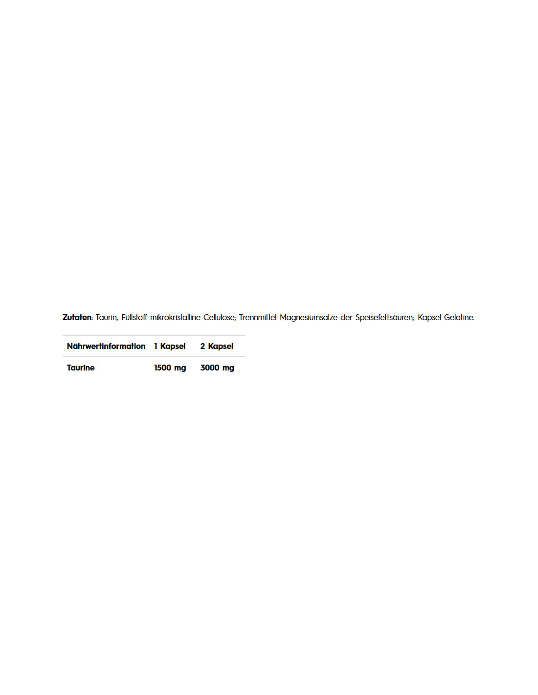 Zutaten: Taurin, Füllstoff mikrokristalline Cellulose; Trennmittel Magnesiumsalze der Speisefettsäuren; Kapsel Gelatine.
