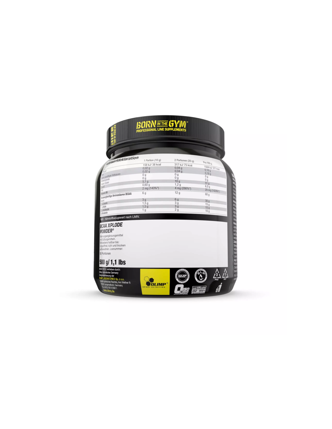 Zutaten: BCAA Aminosäuren (L-Leucin, L-Valin, L-Isoleucin), Säureregulatoren Citronensäure, Natriumcitrate; L-Glutamin, Aromen, Verdickungsmittel Gummi arabicum; Farbstoff E 150d (bei Geschmack Xplosive Cola); Süßungsmittel Acesulfam K, Sucralose; Trennmittel Calciumphosphate, Siliciumdioxid; Emulgator Lecithine (aus Soja); Pyridoxinhydrochlorid (Vit. B6), Farbstoffe: Carotin (A), Echtes Karmin (B), Riboflavine (C), E 150c (D), E 150d (E), E 133 (F).
