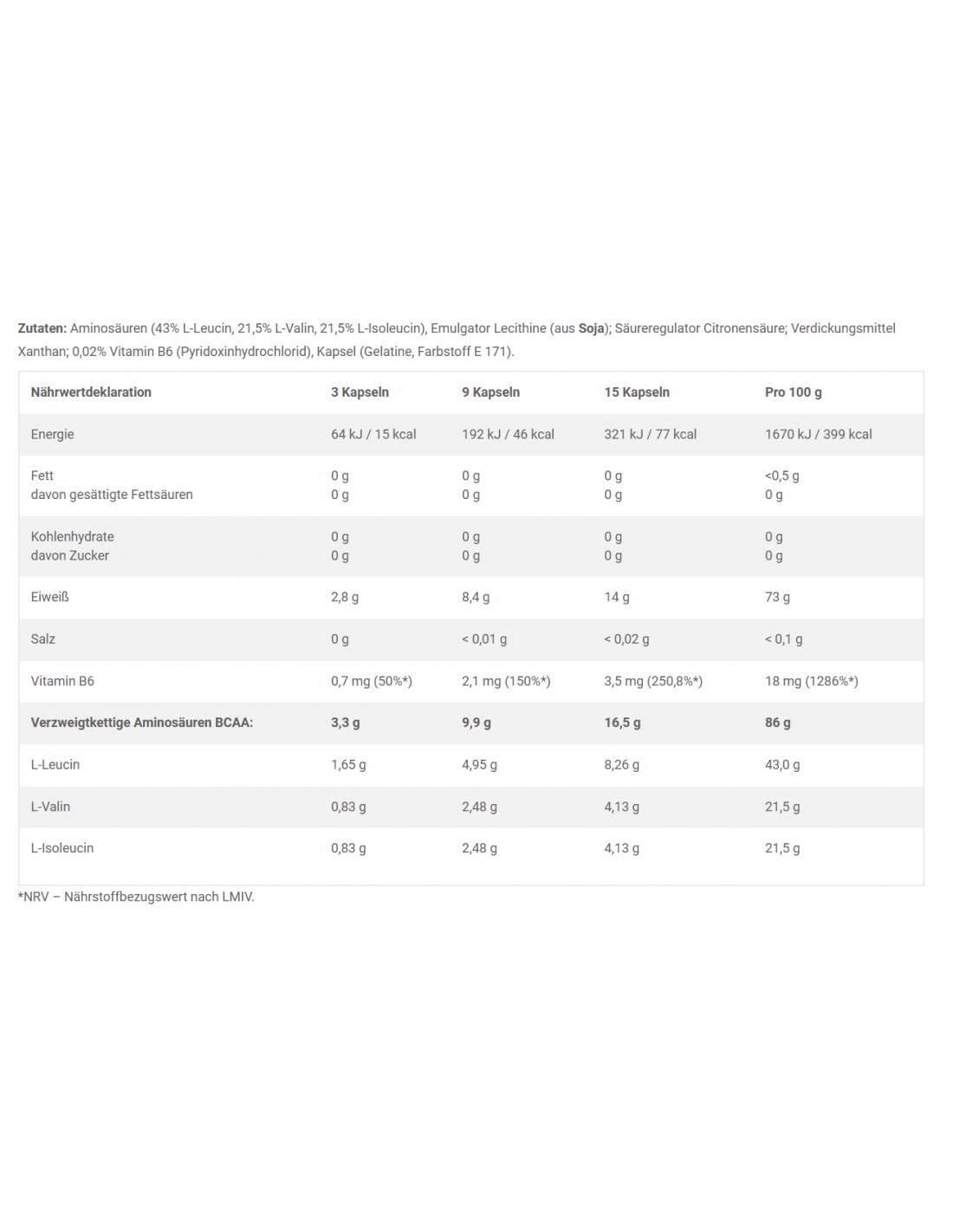 Aminosäuren (43% L-Leucin, 21,5% L-Valin, 21,5% L-Isoleucin), Emulgator Lecithine (aus Soja); Säureregulator Citronensäure; Verdickungsmittel Xanthan; 0,02% Vitamin B6 (Pyridoxinhydrochlorid), Kapsel (Gelatine, Farbstoff E 171).