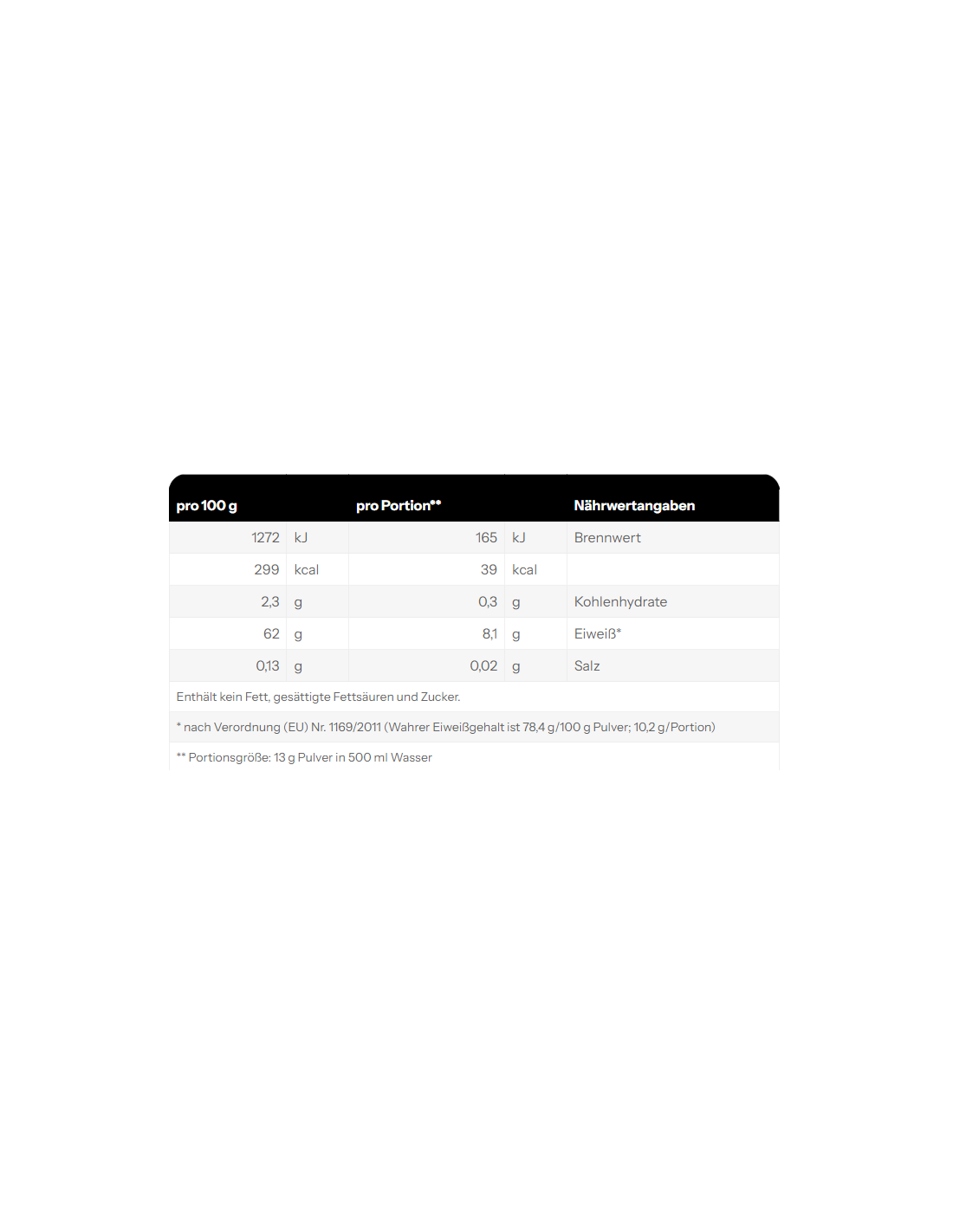 1 Portion = 13 g Pulver (1 Messlöffel) mit 500 ml Wasser shaken.