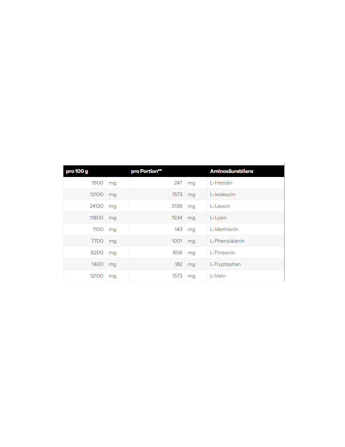 24,12% L-Leucin, 14,6% L-Lysinhydrochlorid, Säuerungsmittel: Citronensäure; 12,1% L-Isoleucin, 12,1% L-Valin, 7,7% L-Phenylalanin, 6,2% L-Threonin, 1,9% L-Histidin, 1,4% L-Tryptophan, 1,1% L-Methionin, Aroma, Süßungsmittel: Acesulfam-K, Sucralose, Steviolglycoside; Trennmittel: E551; Emulgatoren: E322 (Soja), E471; Farbstoff: Beta-Carotin.