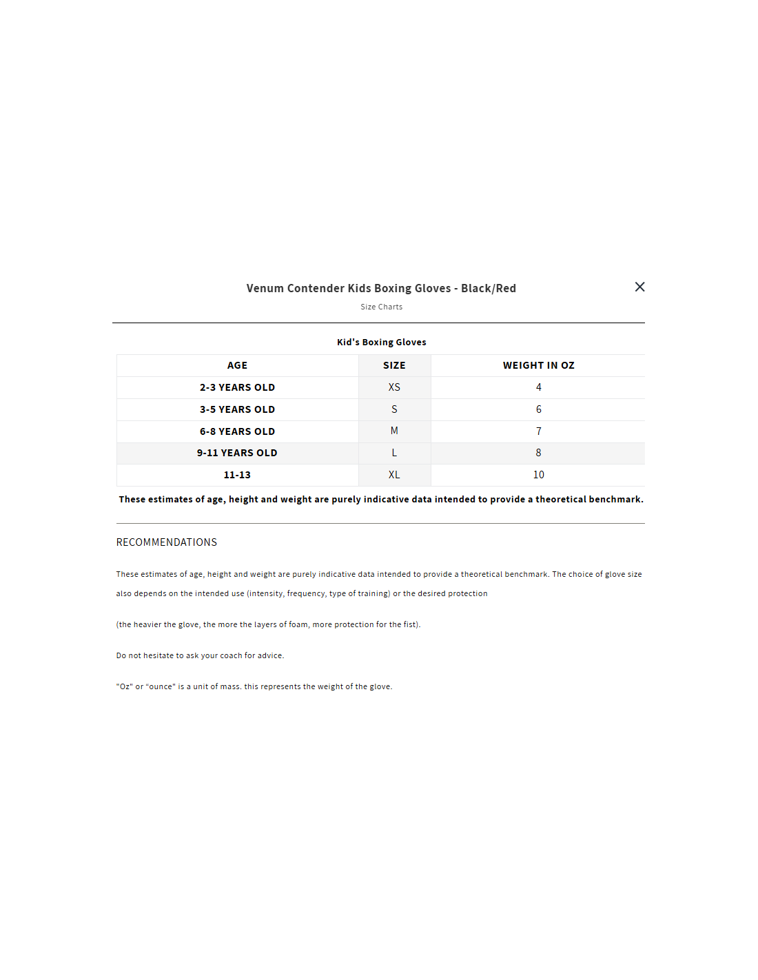 Ounces indicate the weight and therefore the size of the boxing gloves. The higher the weight, the thicker the padding. In relation to the ounces, the size of the boxing gloves is also referred to as the size of the weight. Depending on the size and age of the children, boxing gloves in sizes 6 to 10 OZ are used.