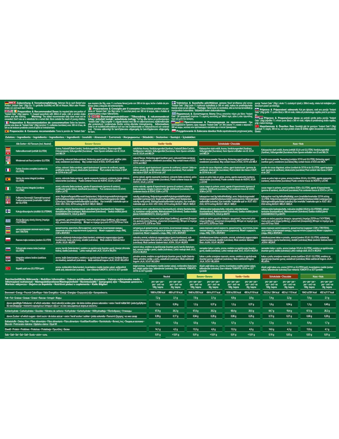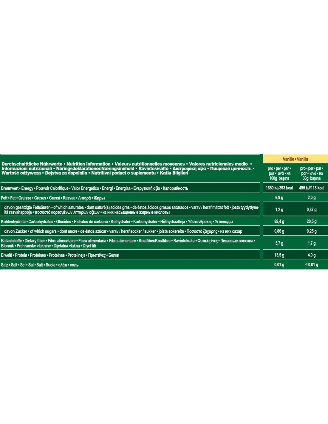 Vanille: Hafervollkornmehl (enthält GLUTEN), natürliches Aroma, Verdickungsmittel (Xanthan), Farbstoff (Beta-Carotin), Vanillepulver natürlich, Süßungsmittel (Sucralose). Kann Spuren enthalten von EI, SOJA und MILCH.