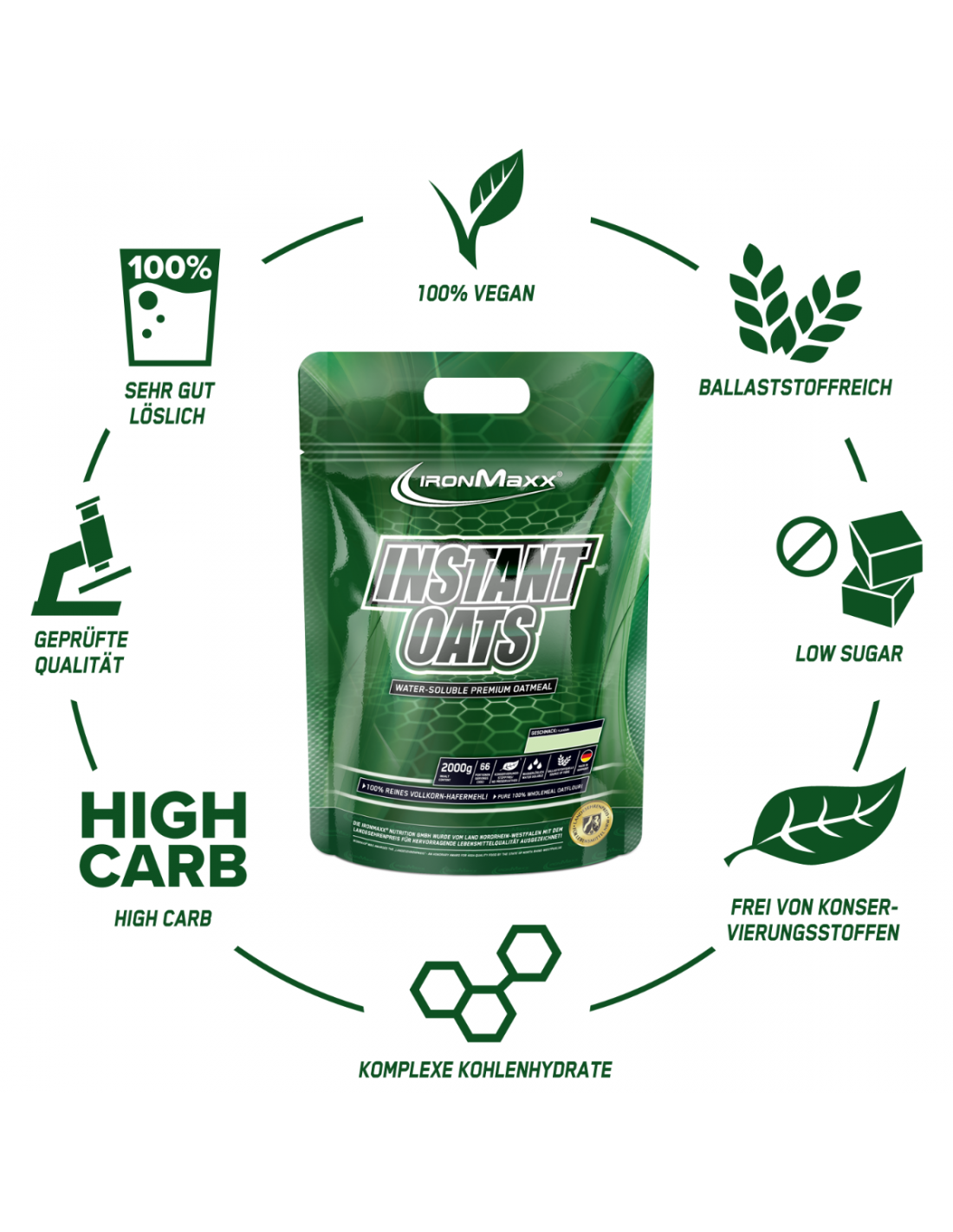Instant Oats are versatile and an excellent source of energy. IronMaxx® Instant Oats are a valuable dietary supplement made from finely ground whole grain oat flakes and are ideal as a source of carbohydrates for athletes and health-conscious people. With up to 68g of complex carbohydrates and up to 396 kcal per 100g, this product offers a long-lasting energy supply. But it is not only a great source of energy. The high fiber content also makes it a flexible food. Whether as a tasty oatmeal for breakfast, as a supplement to your protein shake before or after training, or as a snack in combination with nuts and fruit - the possible uses are almost unlimited.
