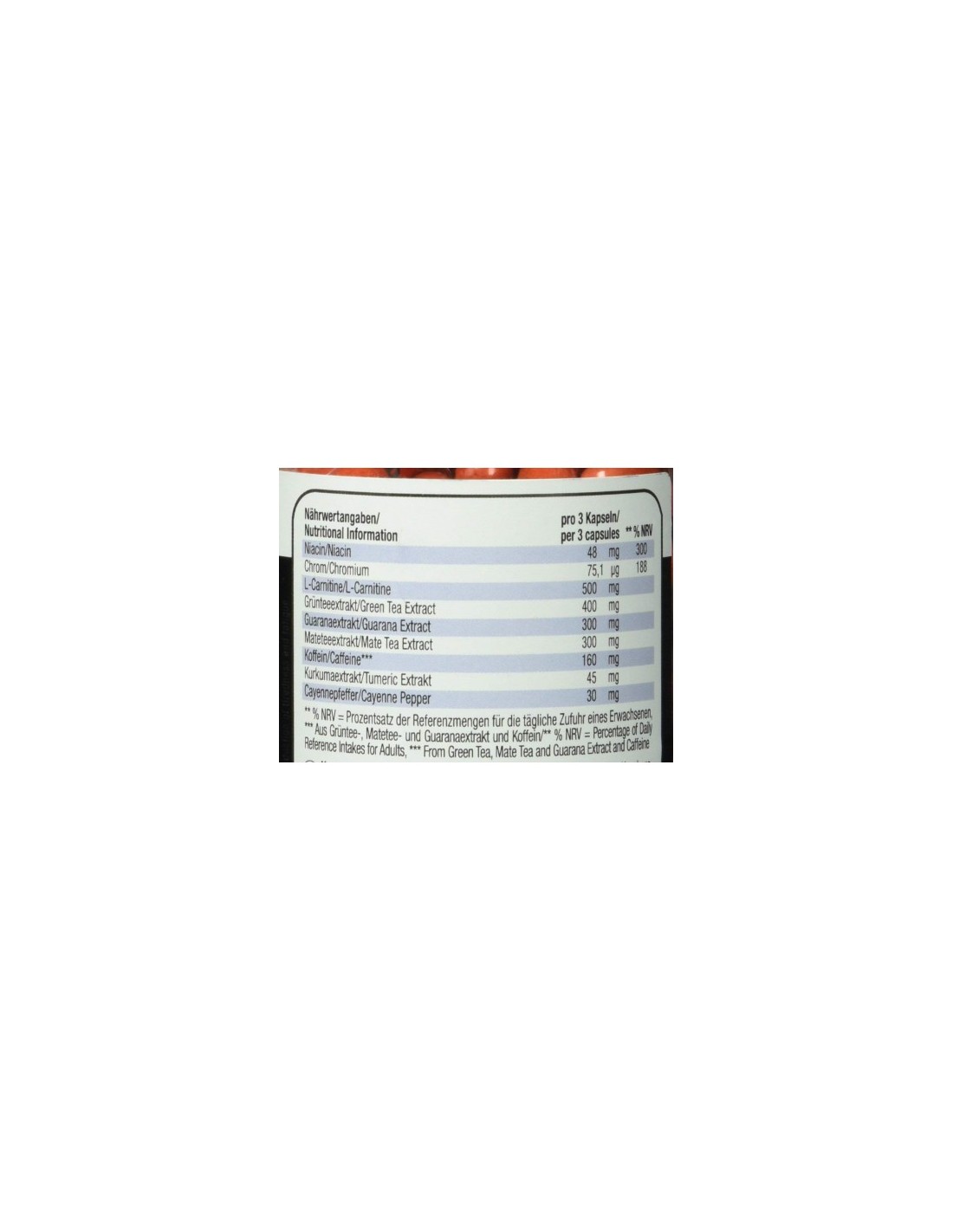 L-Carnitin-L-Tartrat, Grünteeextrakt, Gelatine (Rind), Guaranaextrakt, Mateteeextrakt, Koffein, Niacin, Kurkumaextrakt, Trennmittel: Magnesiumsalze der Speisefettsäuren; Cayennepfeffer, Farbstoffe: E129, E172; Chrom(III)Chlorid. E129: Kann die Aktivität und Aufmerksamkeit bei Kindern beeinträchtigen.