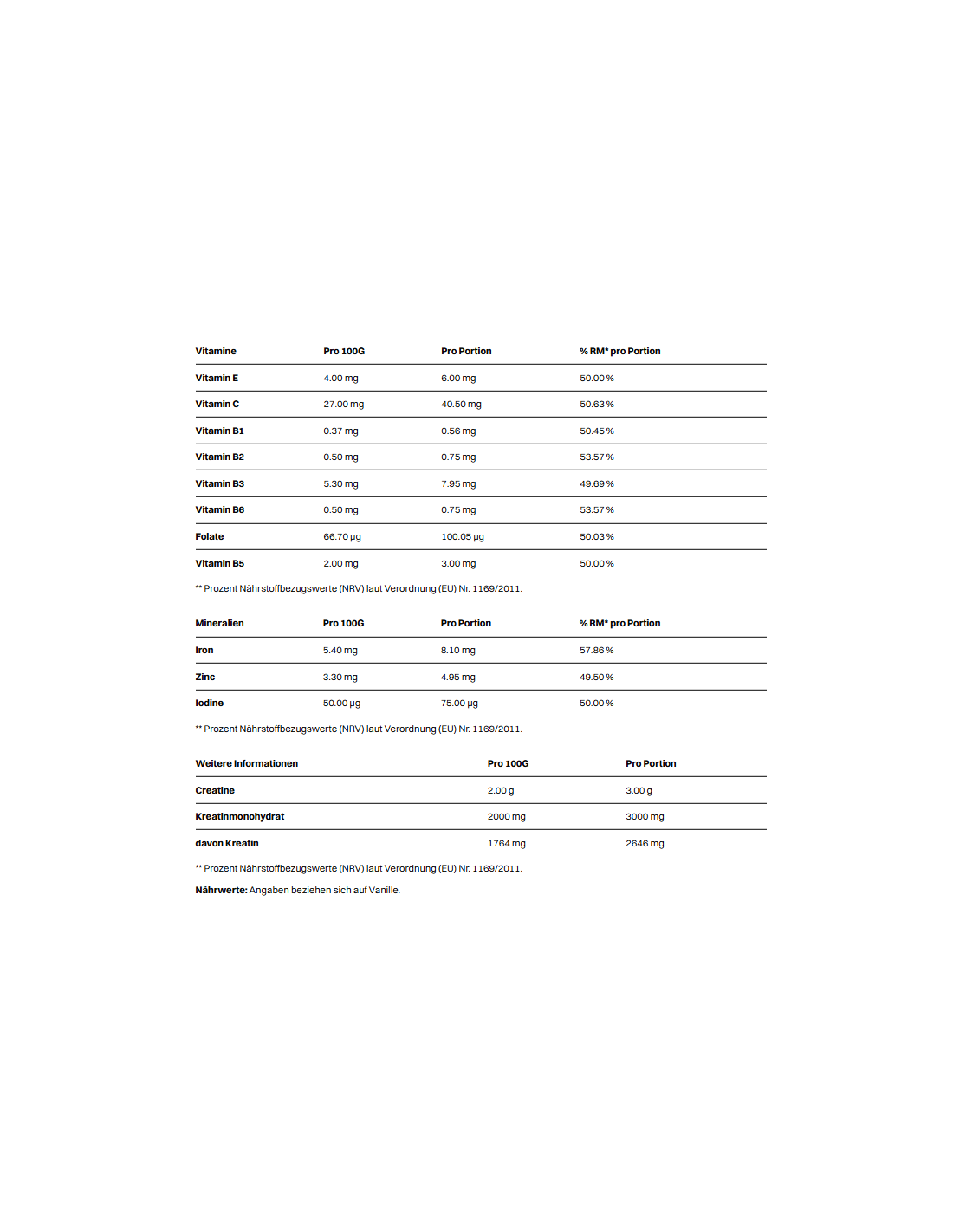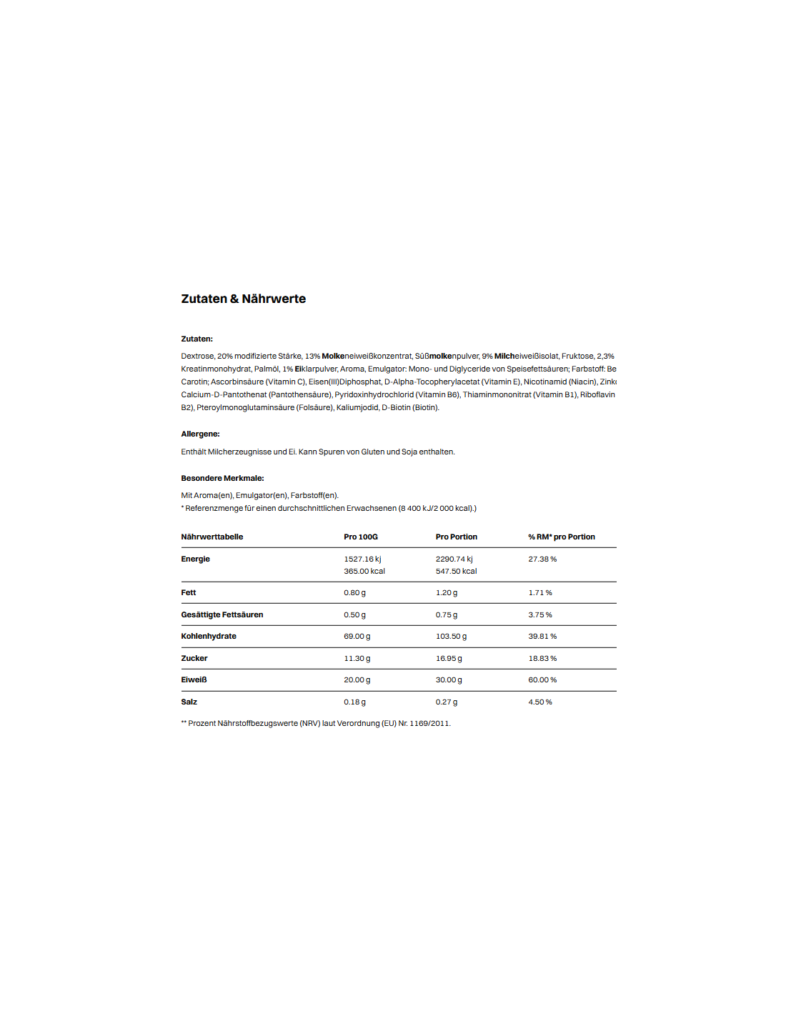 Kohlenhydratmischung (Mais-Maltodextrin, native Weizenstärke, Hafermehl, native Kartoffelstärke), Eiweißmischung (Milcheiweißisolat¹, Molkeneiweißkonzentrat¹, Eiklarpulver), Süßmolkenpulver¹, 2,3% Kreatinmonohydrat, mittelkettige Triglyzeride (aus Palmöl), Aroma, Süßungsmittel: Acesulfam-K, Sucralose, Steviolglycoside; Verdickungsmittel: Guarkernmehl; Trennmittel: Siliciumdioxid; Farbstoff: Beta-Carotin; Ascorbinsäure, Eisen(III)Pyrophosphat, Vitamin E, Niacin, Zinkoxid, Pantothensäure, Vitamin B6, Vitamin B1, Vitamin B2, Folsäure, Kaliumjodid. ¹ Enthält Laktose. Kann Spuren von Soja enthalten.