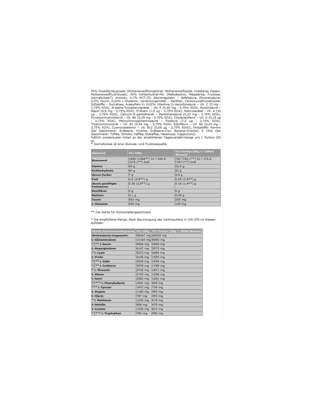 56% Eiweißerzeugnisse (Molkeneiweißkonzentrat (aus Milch), Molkeneiweißisolat (aus Milch), mizellares Kasein (aus Milch), Molkeneiweißhydrolysat (aus Milch)), 40% Kohlenhydrat-Mix (Maltodextrin, Maisstärke, Fructose, Isomaltulose**), Aromen, 0,7% Mittelkettige Triglyceride Öl (MCT-Öl), Säureregulatoren Apfelsäure, Citronensäure; 0,5% Taurin, 0,25% L-Glutamin, Verdickungsmittel Gummi arabicum, Xanthan, Natrium-Carboxymethylcellulose; Süßungsmittel Acesulfam K, Sucralose; Emulgator Lecithine (aus Soja); Farbstoffe: Carotin (A), Echtes Karmin (B), Riboflavine (C), E 150c (D), E 150d (E), E 133 (F), Patentblau V (G), Indigokarmin (H), Chlorophylie und Chlorophylline (I), Kurkumin (J), Anthocyane (K), Paprikaextrakt (L), Betanin (M), Pflanzenkohle (N). (A)-(Z) — Je nach Geschmack des Produktes befindet sich das Symbol (A-Z) der verwendeten Komponenten neben dem Mindesthaltbarkeitsdatum (mindestens haltbar bis).