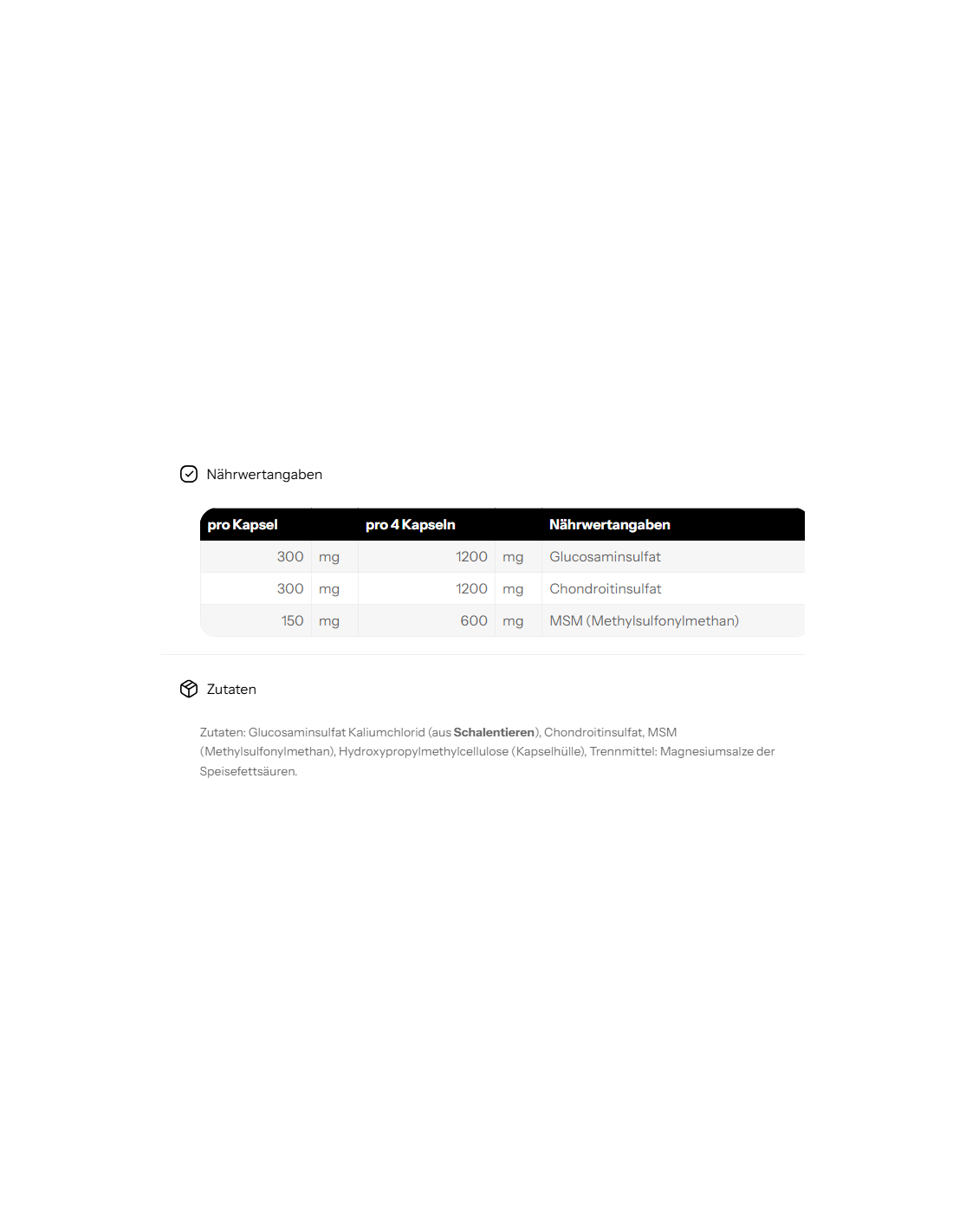 Glucosaminsulfat Kaliumchlorid, Chondroitinsulfat, MSM (Methylsulfonylmethan), Gelatine (Rind), Trennmittel: Magnesiumsalze der Speisefettsäuren; Farbstoff: E172.