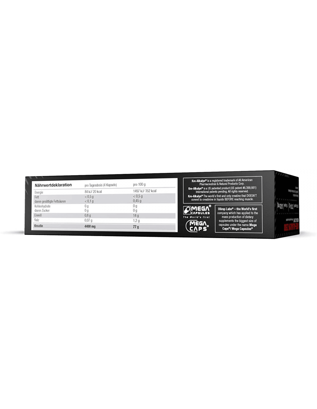 Olimp Kre-Alkalyn 2500 Mega Caps consist of acid-buffered and therefore pH-neutral creatine. It is the original and patented Kre-Alkalyn with the US patent. Athletes in particular who have problems tolerating normal creatine monohydrate rely on Olimp Kre-Alkalyn 2500 Mega Caps. Bodybuilders and strength athletes report a tougher appearance compared to taking normal creatine monohydrate. This is the advantage of Olimp Kre-Alkalyn 2500 Mega Caps!
