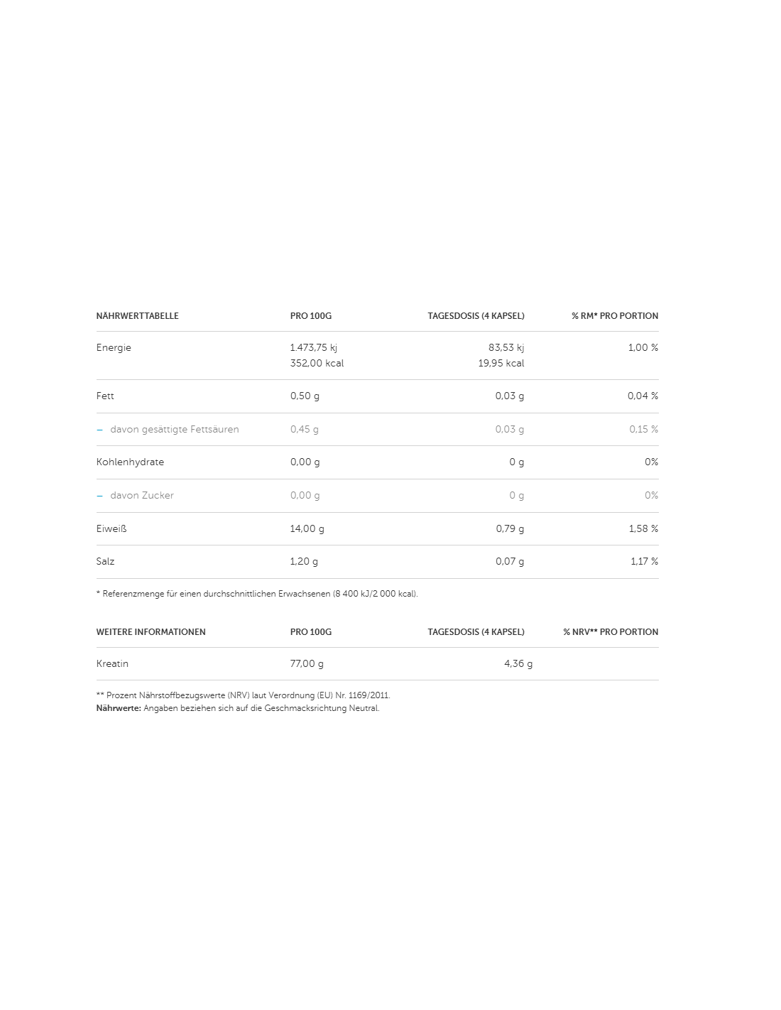 An Trainingstagen 2 Kapseln morgens und 2 Kapseln vor dem Training einnehmen. Nur trainings- oder wettkampfbedingt verwenden. Es kann eine Gewichtszunahme erfolgen. Für Kinder und Jugendliche nicht geeignet. Die Zufuhr des kreatinhaltigen Erzeugnisses sollte nicht dauerhaft, sondern zeitlich begrenzt erfolgen. Es wird empfohlen, das Produkt 2-3 Monate lang zu verzehren, dann eine Pause für 1-2 Monate zu machen und wenn nötig nach der Pause zu wiederholen. Außerhalb der Reichweite von Kindern aufbewahren. Eine ausgewogene und abwechslungsreiche Ernährung und eine gesunde Lebensweise werden empfohlen.