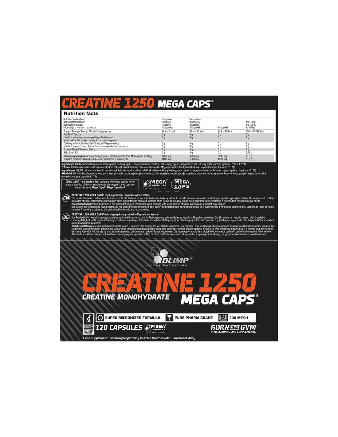 Scientific research has shown that creatine increases physical performance during high-speed strength training as part of short-term intensive physical activity, which makes it easier to work on your muscular physique. This applies in the case of a daily intake of 3 g creatine. In the recommended daily portion of Olimp Creatine 1250 Mega Caps (3 capsules) you get up to 3.3 g of pure creatine, which is contained in a food supplement of Olimp Sport Nutrition is included!