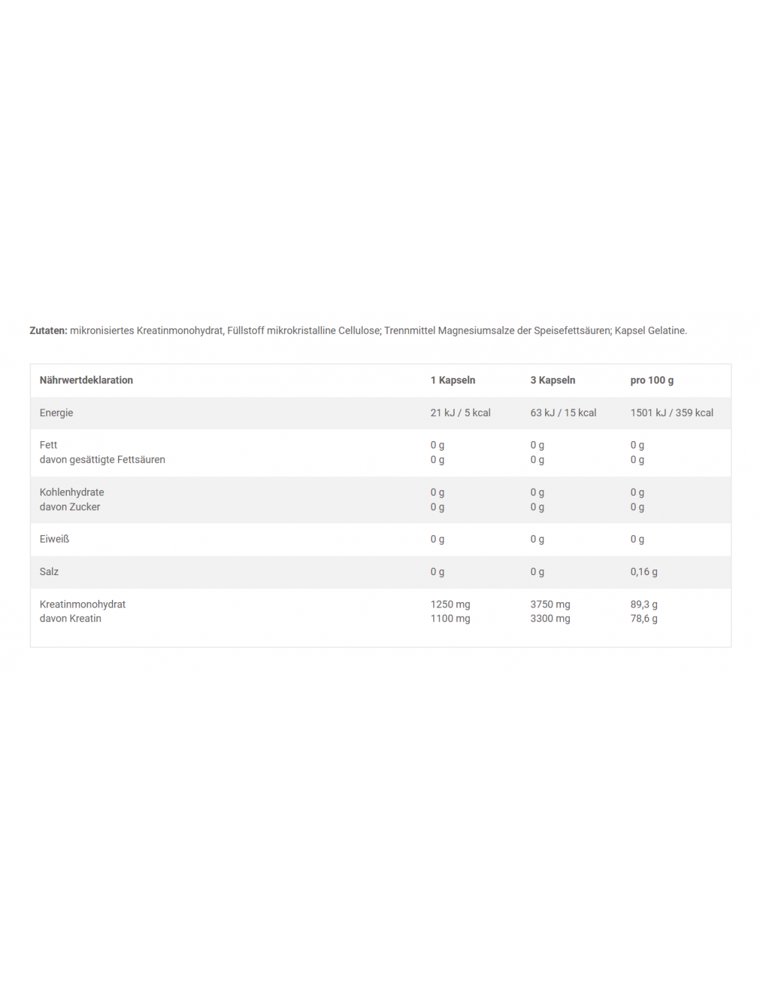 mikronisiertes Kreatinmonohydrat, Füllstoff mikrokristalline Cellulose; Trennmittel Magnesiumsalze der Speisefettsäuren; Kapsel Gelatine.