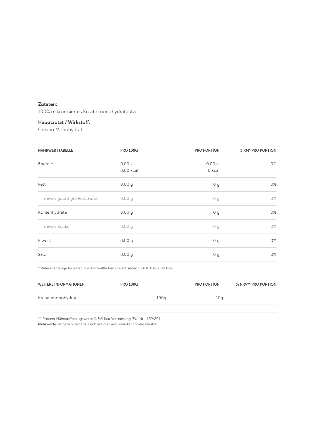 Zutaten: 100% mikronisiertes Kreatinmonohydrat.
