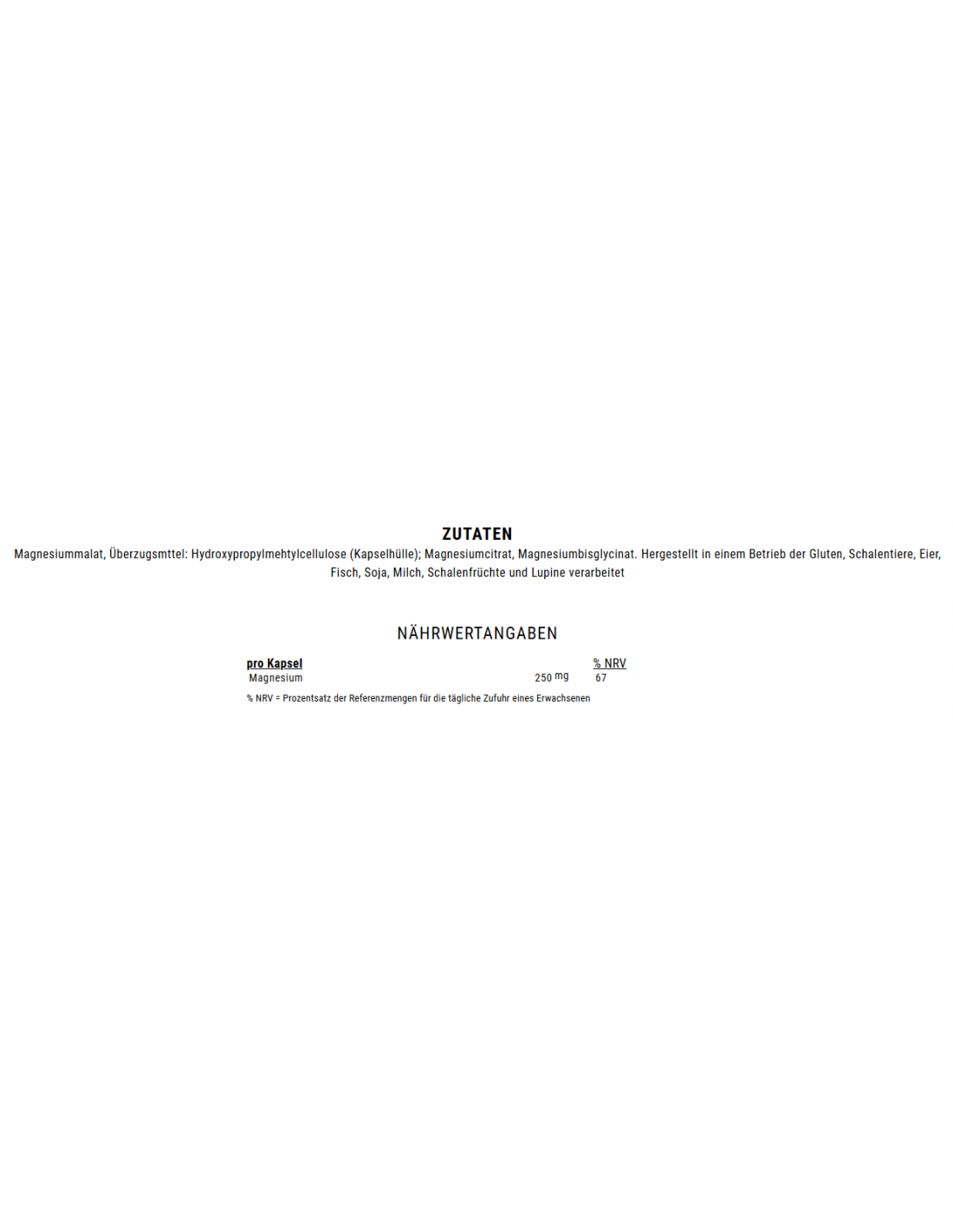 Magnesiummalat, Überzugsmttel: Hydroxypropylmehtylcellulose (Kapselhülle); Magnesiumcitrat, Magnesiumbisglycinat. Hergestellt in einem Betrieb der Gluten, Schalentiere, Eier, Fisch, Soja, Milch, Schalenfrüchte und Lupine verarbeitet
