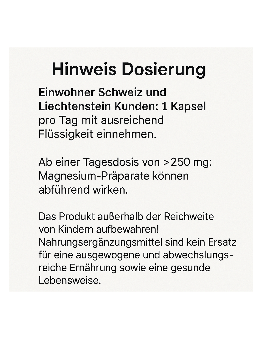 Hinweis Dosierung Einwohner Schweiz und Liechtenstein Kunden: 1 Kapsel pro Tag mit ausreichend Flüssigkeit einnehmen.