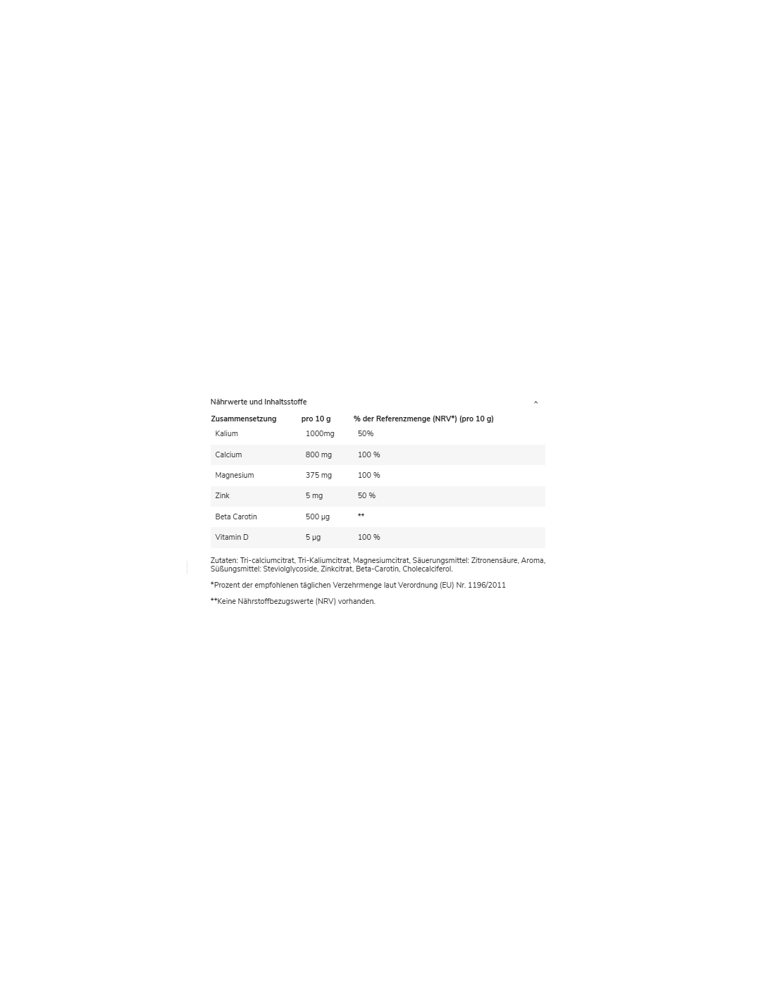 Zutaten: Tri-calciumcitrat, Tri-Kaliumcitrat, Magnesiumcitrat, Säuerungsmittel: Zitronensäure, Aroma, Süßungsmittel: Steviolglycoside, Zinkcitrat, Beta-Carotin, Cholecalciferol.