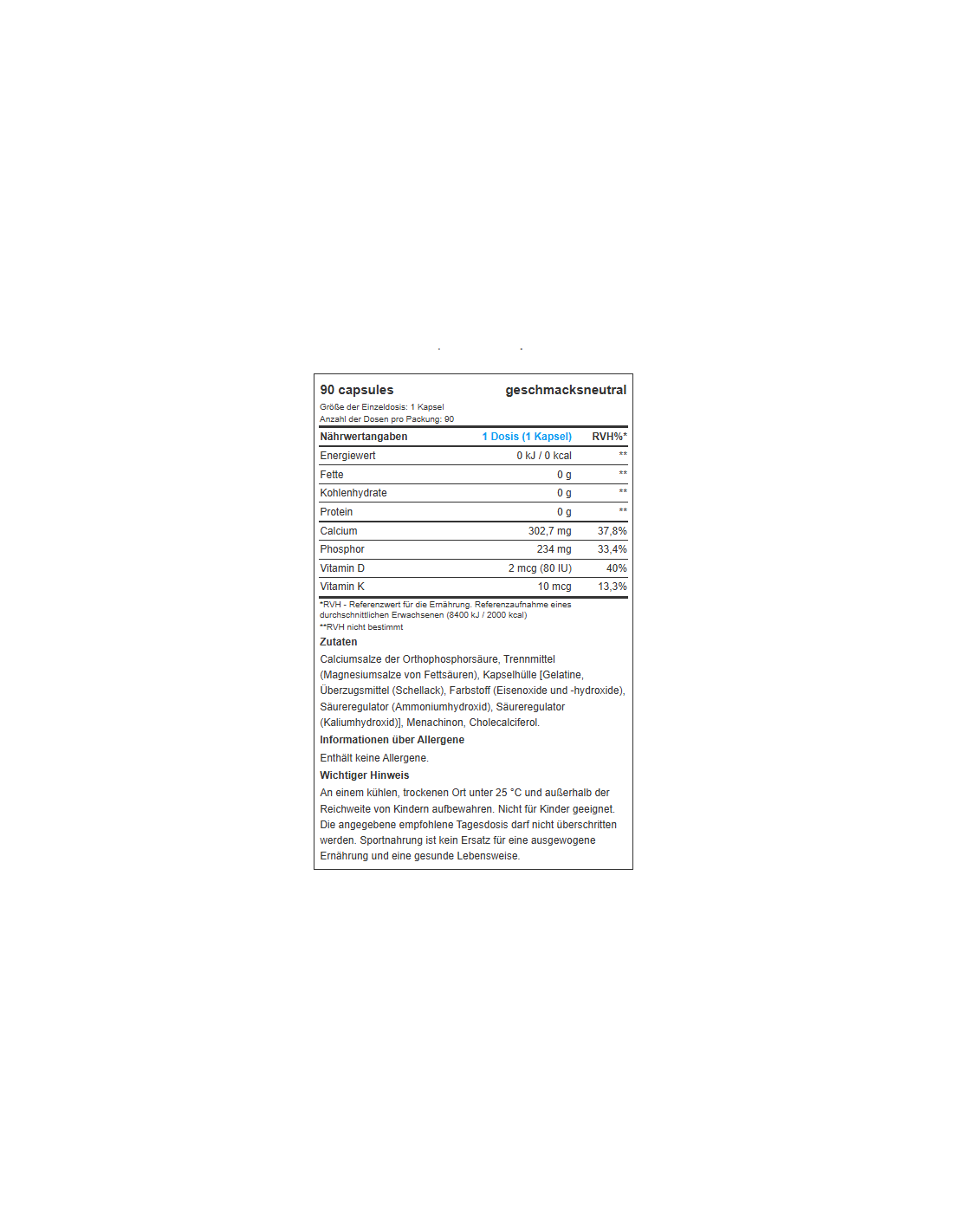 Calciumsalze der Orthophosphorsäure, Trennmittel (Magnesiumsalze der Speisefettsäuren), Kapselhülle [Gelatine, Überzugmittel (Schellack), Farbstoff (Eisenoxide und -hydroxide), Säureregulator (Ammoniumhydroxid), Säureregulator (Kaliumhydroxid)], Menachinon, Cholecalciferol.