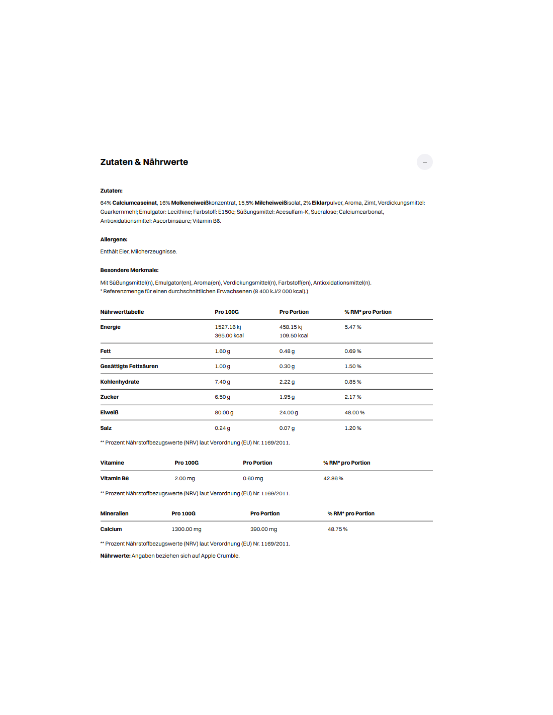 57% Calciumcaseinat¹, 20% Molkeneiweisskonzentrat¹, 18% Milcheiweissisolat¹, 3% Eiklarpulver, Aroma, Verdickungsmittel: Guarkernmehl; Süßungsmittel: Acesulfam-K, Natriumcyclamat, Succralose; Calciumcarbonat, Antioxidationsmittel: Ascorbinsäure; Vitamin B6.