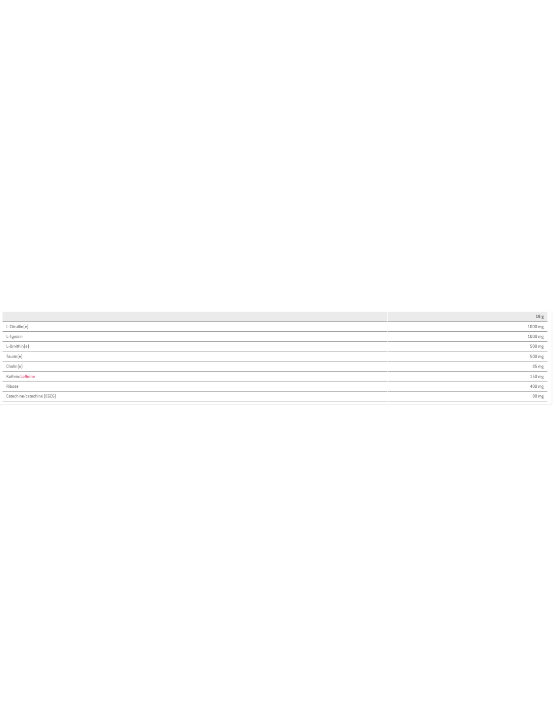 - Dietary supplement in powder form for the preparation of a flavored amino acid drink for athletes with sweeteners. Contains L-citrulline, L-arginine, taurine, and caffeine.